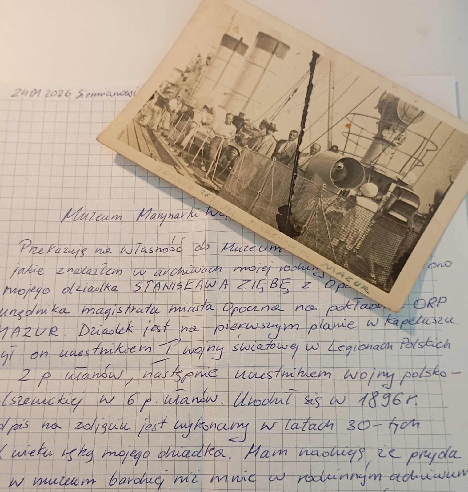 To była sobota 16 lipca 1932 r. gdy pan Stanisław Zięba, urzędnik magistracki z Opoczna odwiedził Gdynię i pokład torpedowca ORP Mazur . Godnie prezentuje się gdy elegancko ubrany, w kapeluszu, czujnie spogląda w obiektyw. W grupie współtowarzyszy znalazł się na okręcie przypuszczalnie udostępnionym tego dnia do zwiedzania. Ze zbiorów MMW.1 punkt