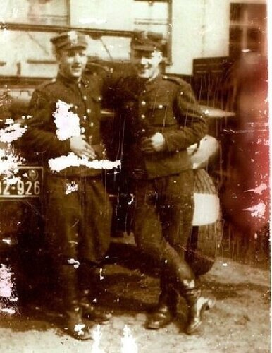 Po pierwsze - aby zdjęcie było prawdziwe trzeba odwrócić w poziomie. Zrobione. Po drugie - fotografia powojenna, co widać po tablicy rejestracyjnej samochodu (wojskowa - najprawdopodobniej po r. 1950). Obaj żołnierze to szeregowcy, samochód - najprawdopodobniej DODGE WC, jeep. -