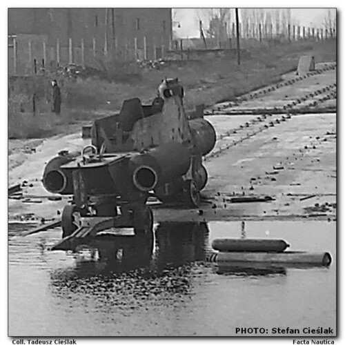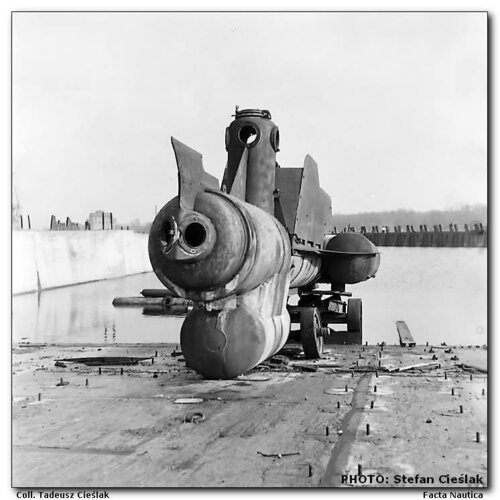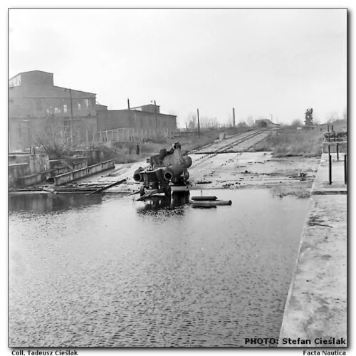 Zagadkowy obiekt na pochylni byłej stoczni Vulcan w Szczecinie interpretowano jako wrak małego okrętu podwodnego. Fotografia: Stefan Cieślak, czerwiec 1947 roku (coll. Tadeusz Cieślak). --------Od czasu do czasu pozwalam sobie zajrzeć na strony Facta Nautica. Zwróciłem m.in. uwagę na zdjęcie małego okrętu podwodnego na pochylni stoczni Vulcan w Szczecinie. Tak się składa, że autorem tych zdjęć, bo jest ich kilka, jest mój ojciec Stefan Cieślak. Był w tym czasie fotoreporterem "Kuriera Szczecińskiego" (wtedy powstały te akurat zdjęcia), potem "Głosu Szczecińskiego". Zmarł w czerwcu roku ubiegłego. Posiadam obecnie zdjęcia jak i filmy z jakich powstały. --------Porządkując jego archiwum natrafiłem właśnie na zdjęcia tego obiektu. Piszę „obiektu” bowiem tak naprawdę nikt nie wie co to jest. Ponieważ interesuję się okrętami podwodnymi, mam trochę materiałów na ten temat, mocno wątpię aby był to faktycznie miniaturowy op. Nigdy nie słyszałem o budowaniu przez tę stocznię miniaturowych jednostek szturmowych, a i sam wygląd tego obiektu nie kojarzy się z żadną znaną jednostką tego typu. Nie zapominajmy przy tym – koniec wojny to nie okres kiedy niemiecka marynarka myślała o zaatakowaniu obcych portów, a głównie do tego stosowana jest taka broń. Zwróciłem się na wszelki wypadek z prośbą do Tomasza Grotnika z miesięcznika „Morze Statki i Okręty”. Wymienialiśmy uwagi. On debatował nad fotografią jaką mu przesłałem, zasięgał informacji u swoich kolegów po fachu. I znów – nic.... Obaj uznaliśmy więc, że jest to najprawdopodobniej część większej konstrukcji np. silnika statku. --------Skąd więc pokutujące przekonanie, bo zdjęcie to było publikowane w kilku czasopismach, o budowaniu w Szczecinie miniaturowych okrętów podwodnych ? Cóż, pytałem o to mojego ojca. Wyznał, że informację taką uzyskał w czerwcu 1947 roku od pracujących tam robotników. Oczywiście nie stoczniowców niemieckich lecz polskich, którzy nie byli przecież w latach wojny w stoczni Vulcan, tym bardziej nie mieli nic wspólnego z jej konstrukcjami. Sam przez prawie ćwierć wieku byłem dzienikarzem. Wiem jak niekiedy wygląda zbieranie materiału, a nade wszystko jak wygląda zachowanie ludzi. Szczególnie tych prostszych. Chcą pomóc. A tu przyszedł fotoreporter (wtedy to była naprawdę rzadkość), cykał zdjęcia, pytał, interesował się, zagadywał... Jak mu nie odpowiedzieć ? Stoi coś tam nad wodą, dziwaczne, nieznane. Przyznać się, że się samemu nie wie ? Pytał, tak więc chłopaki mu odpowiedzieli. No, ani chybi m u s i a ł być to niemiecki okręt podwodny. - A mało to rakiet, pancerfaustów i inszych tam, panie tego, różnych Panter oni naprodukowali ! Co to dla nich taki mały okręt podwodny. --------O pomyłkę nietrudno. Fotoreporter był w stoczni, cyknął, widział, dotykał, a nawet języka zasięgnął – i już leci na łamy interesujący materiał, zwłaszcza, że mój ojciec jak i jego koledzy z redakcji (wtedy młode chłopaki) morzem, jednostkami morskimi interesowali się nie za bardzo. Na głowie mieli wszyscy odbudowę miasta, nowe mieszkania, repatriantów, czyny społeczne, odgruzowywanie dzielnic, a nie porzucone wraki. Na to przyjdzie czas za kilkadziesiąt lat. --------Ponieważ, jak wspomniałem, zaglądam na łamy FN, podziwiam pański zbiór ( brytyjski typ A, szczególnie zdjęcie HMS A7, pozwoliło mi zorientować się co do szczegółów jego budowy), pomyślałem, że mógłbym panu je podesłać. Ot, chociażby dlatego, aby trafiły w dobre ręce, a marynistom, zbieraczom wszelakości zwrócić uwagę na kiksy jakie mogą się przytrafiać przy tym jakże interesującym hobby. WYPOWIEDŹ WALDEMARA DANIELEWICZA ---------Waldemar Danielewicz 5 marca 2014 roku zareagował na tekst Tadeusza Cieślaka przesyłając do Facta Nautica następujący e-mail: "Chciałem zabrać głos w sprawie tajemniczego obiektu na byłej Stoczni „Vulcan” w Szczecinie. Otóż na pewno nie jest to część silnika. Po analizie wielu materiałów dotyczących niemieckich miniaturowych okrętów podwodnych oboje z moim kolegą inż. Michałem Krężelewskim wykładowcą budownictwa okrętowego na Politechnice Gdańskiej stwierdziliśmy, na 90 % że jest to niedokończony miniaturowy okręt podwodny a w zasadzie jego tylko kadłub sztywny bez kadłuba miękkiego." - http://uboat.graptolite.net/wulkan.html