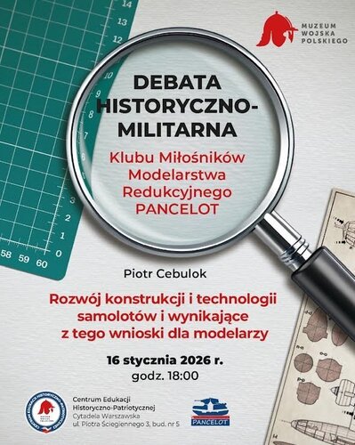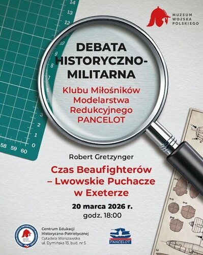 10. Szanowni Państwo, zapraszamy na spotkanie organizowane przez Muzeum Wojska Polskiego, Klubu Miłośników Modelarstwa Redukcyjnego „Pancelot” oraz IMPS Polska, które odbędzie się w najbliższy piątek, 20 marca 2026 r. o godzinie 18:00 w budynku nr 5 na terenie Cytadeli w Warszawie. W ramach spotkania odbędzie się debata pt. Czas Beaufighterów - Lwowskie Puchacze w Exeterze, którą poprowadzi Robert Gretzynger. Po debacie omówione zostaną sprawy związane ze zbliżająca się ogólnopolską wystawą modelarską, jaką planujemy zorganizować w MWP w Warszawie. ŁM/KW