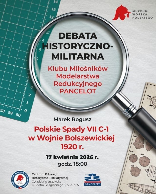 Szanowni Państwo, zapraszamy na spotkanie organizowane przez Muzeum Wojska Polskiego, Klubu Miłośników Modelarstwa Redukcyjnego „Pancelot” oraz IMPS Polska, które odbędzie się 17 kwietnia 2026 r. o godzinie 18:00 w budynku nr 5 na terenie Cytadeli w Warszawie. W ramach spotkania odbędzie się prelekcja pt. „Polskie Spady VII C-1 w Wojnie Bolszewickiej 1920 r.”, którą poprowadzi Marek Rogusz. Krzysztof Wagner, Łukasz Matwiński -