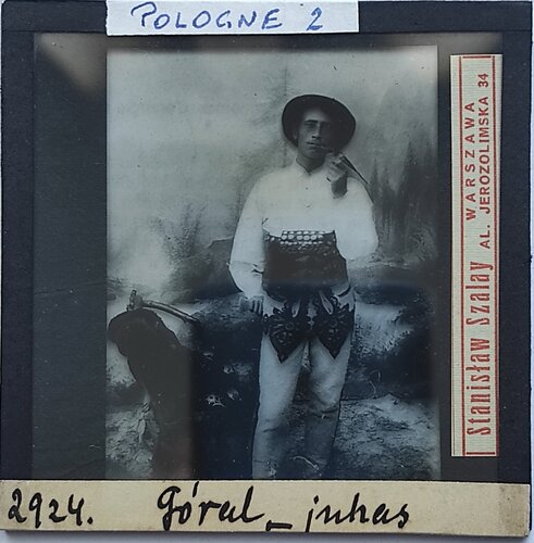 Dzień dobry, szukam wszystkich informacji na temat tych zdjec. Z góry dziękuję Co wiem... Autor: Stanisław Szalay (1867–1920) Technika: Diapozytyw szklany, emulsja bromosrebrowa, ręcznie retuszowana Wymiary: 8 x 8 Data: ok. 1910 Sygnatura: STANISLAW SZLAY WARSZAWA AL.JEROZOLIMSKA 34 Proweniencja: Zakład fotograficzny Szalaya, Warszawa, Aleje Jerozolimskie 34. Diapozytyw prawdopodobnie część serii edukacyjnej przygotowanej dla Komisji Fotograficznej PTK lub wykładów krajoznawczych. 1)Tytuł: Góral z kobzą Opis: Na tle surowej ściany z bali, mężczyzna w tradycyjnym stroju ludowym gra na kobzie — polskiej odmianie dud. Ubrany w długi płaszcz i kapelusz, siedzi na prostym krześle, pogrążony w muzyce. Jego postawa jest skupiona, niemal medytacyjna. Szalay nie tylko rejestruje obraz — on go komponuje. Log cabin jako tło to nie przypadek: to rama dla gestu, który mówi o zakorzenieniu, o rytmie życia wiejskiego, o dźwięku jako formie pamięci. Symbolika: Kobza jako instrument to echo dawnej wspólnoty — dźwięk, który towarzyszył obrzędom, weselom, zadumie. Szalay, jako filozof gestu, pokazuje nie tylko muzyka, ale mentalność: melancholijną, rytualną, zakorzenioną. To fotografia jako antropologia duszy. 2)Tytuł: Góral – juhas (wariant samotny) Opis: Mężczyzna w stroju podhalańskim stoi samotnie na tle górskiego krajobrazu. Fajka w ustach, torba lub instrument przewieszony przez ramię, ręce swobodne. Jego postawa jest bardziej dynamiczna niż w poprzednim ujęciu — jakby uchwycony w chwili przejścia, między obowiązkiem a kontemplacją. Brak owcy nie odbiera mu roli pasterza — przeciwnie, wzmacnia symbol samotności i czujności, tak typowej dla góralskiego etosu. Symbolika: To portret człowieka w drodze — nie tylko fizycznie, ale duchowo. Torba na ramieniu może być znakiem wędrówki, instrument — znakiem kultury. Fajka to gest trwania, a spojrzenie w dal — znak czuwania. Szalay pokazuje juhasa jako strażnika przestrzeni i pamięci, nie tylko jako pracownika. 3)Tytuł:Taniec zbójnicki Opis: Grupa górali w tradycyjnych strojach tańczy zbójnickiego — taniec rytualny, męski, pełen energii i wspólnotowego rytmu. Tło leśne, wiejskie, z rozproszonym światłem, sugeruje plenerową uroczystość. Ustawienie postaci, ich gesty i stroje tworzą kompozycję dynamiczną, niemal teatralną. Szalay nie tylko rejestruje taniec — on go ikonizuje: jako gest zbiorowy, jako rytuał tożsamości. Symbolika: „Taniec zbójnicki” to taniec, który łączy siłę, rytm i wspólnotę. To gest męskiej inicjacji, wyzwania, odwagi. W kontekście góralskim — to echo zbójnickiej legendy, ale też forma społecznego spoiwa. Szalay pokazuje taniec jako język ciała, który mówi o przynależności, o rytmie ziemi i wspólnoty.