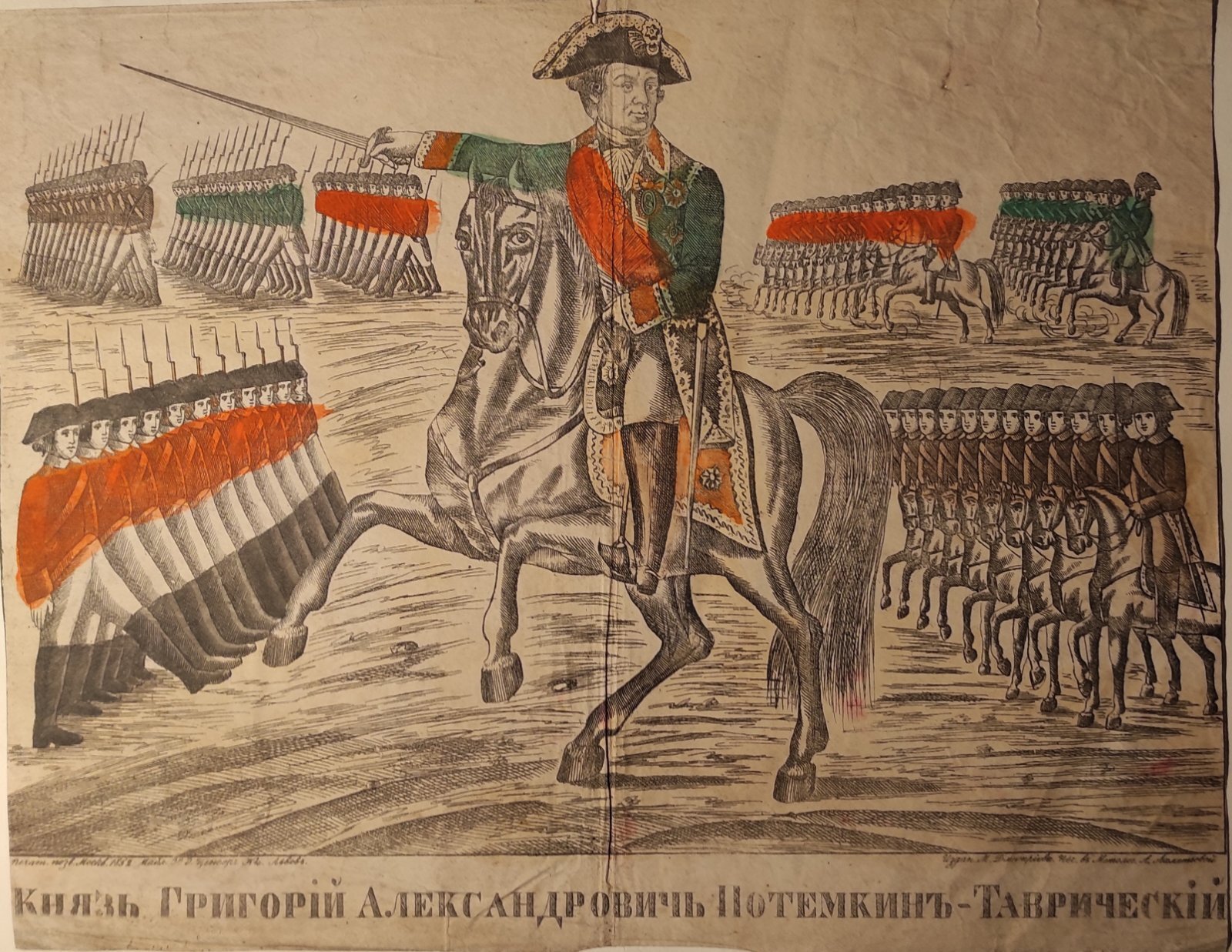 Dzień dobry szukam wszystkich informacji na temat tej ryciny. Z góry dziękuję co wiem... Postać: Książę Grigorij Aleksandrowicz Potiomkin-Tawriczeski — feldmarszałek, doradca Katarzyny II, symbol aneksji Krymu. Technika: Rycina na papierze czerpanym, ręcznie kolorowana (widoczne ślady pędzla, pigmenty akwarelowe). Wymiary: 37 × 29 cm — typowy format dla rycin edukacyjnych, propagandowych lub albumowych. Brak znaku wodnego — typowe dla niektórych rosyjskich i lwowskich druków z połowy XIX wieku. Sygnatura: „Печат. пов. Моск. Вед. Лит. 30 г. Цензоръ Кон. Львовъ.” Wskazuje na wydanie moskiewskie, zatwierdzone przez cenzora Konstantina Lwowa — co nadaje rycinie status urzędowy. Kontekst historyczny Rycina z 1852 roku — potwierdzona inskrypcją i stylem graficznym. Cel: Rycina najprawdopodobniej służyła jako materiał edukacyjny, propagandowy lub urzędowy, przedstawiający Potiomkina jako wzór imperialnego wodza. Dystrybucja: Sygnatura lwowska sugeruje, że rycina była przeznaczona dla odbiorców w Galicji, być może w środowiskach ruskojęzycznych, urzędowych lub szkolnych. Numer „30 г.” w inskrypcji wskazuje, że rycina była 30. pozycją w serii. W połowie XIX wieku powstawały liczne cykle portretów dowódców, scen bitewnych i inscenizacji historycznych, zwłaszcza w kontekście budowania imperialnej narracji.