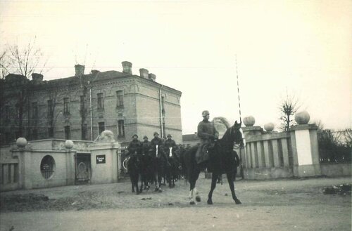 Brama do koszar 2 P.Uł. w czasie okupacji. Widoczne poutrącane łby orłów i Patron pułku zdjęty z cokołu pomnika. -