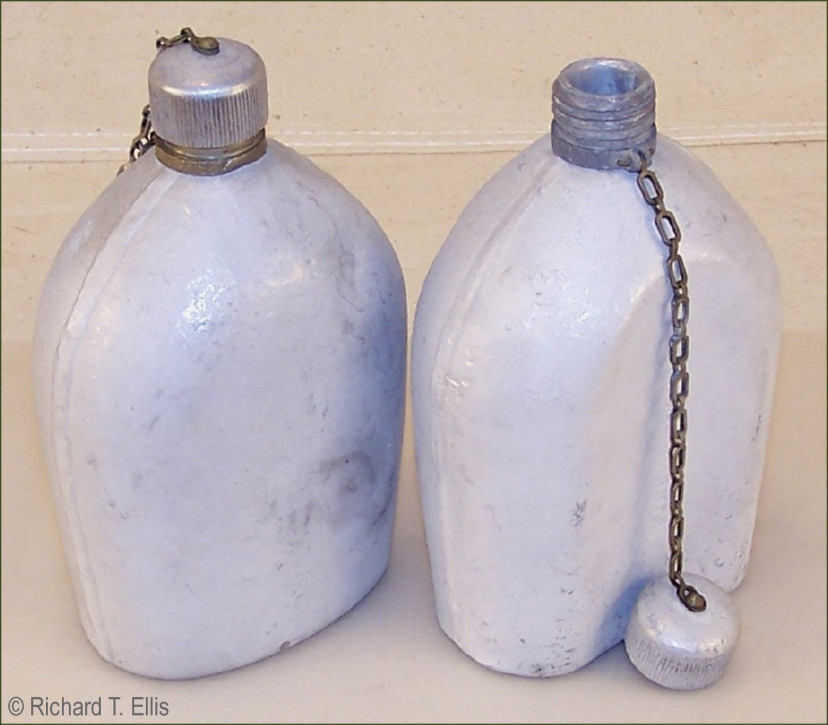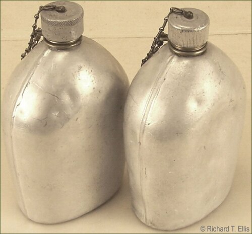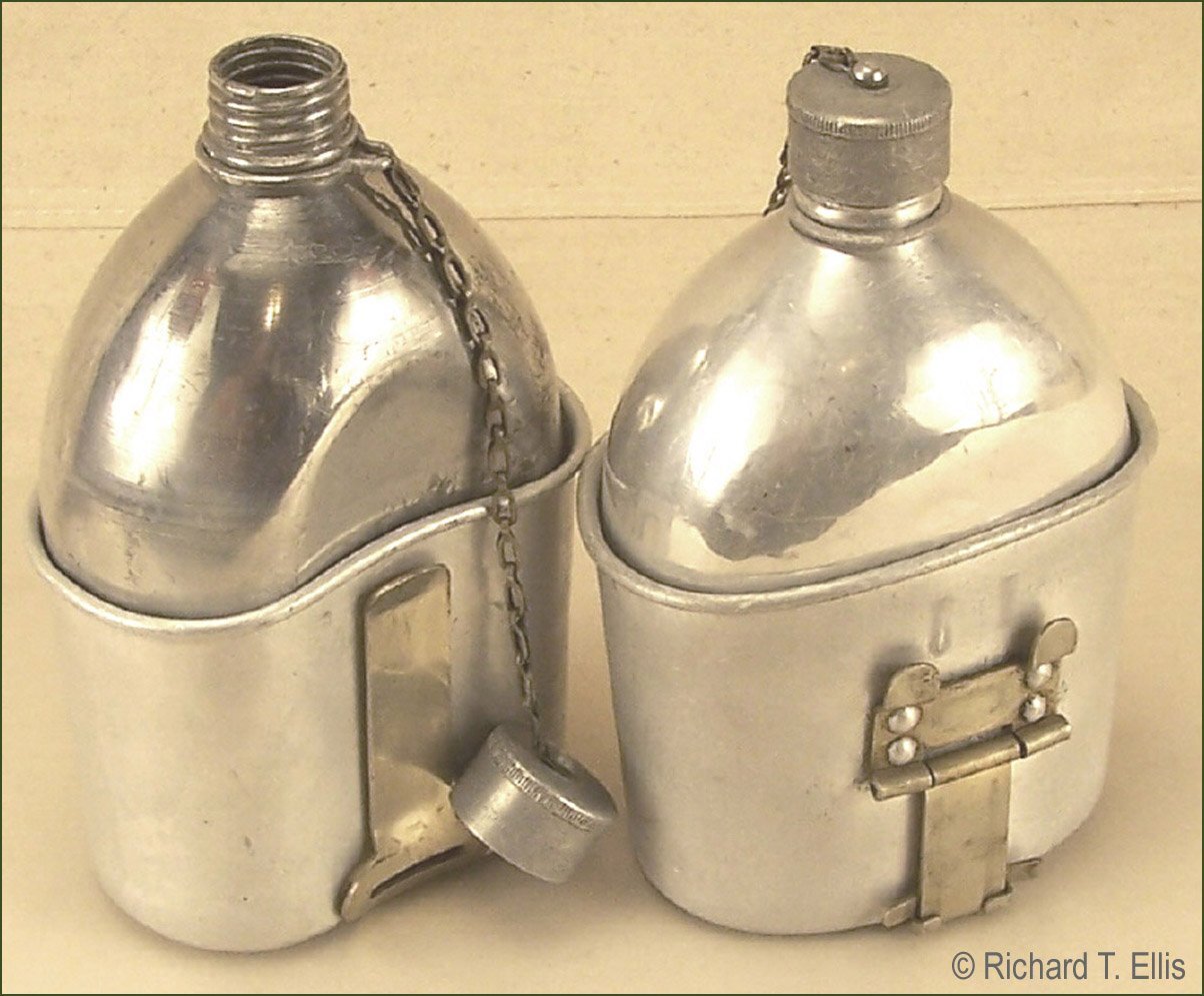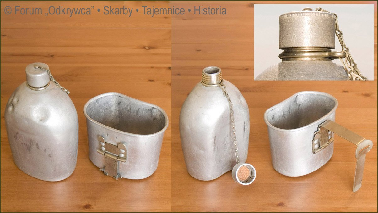 1 Manierka M1910 – pierwsza odmiana, jaka mogła trafić do WP Aluminum Goods Manufacturing Company • 1909 - 1911 Pierwszą amerykańską manierką aluminiową, jaką mogło otrzymać Wojsko Polskie mogła być pierwsza w ogóle taka manierka w siłach zbrojnych Stanów Zjednoczonych. Siłą rzeczy musiała to być manierka opisana w poście powyższym, czyli ta, która zyskała pozytywne opinie w batalionie 10. pułku piechoty. Manierek takich wyprodukowano ponad 250 tys. Z czasem pewną niedoskonałością tych manierek okazała się szyjka, która była trochę za słaba i trzeba ją było wzmocnić poprzez wtłoczenie w szyjkę tulei z nowego srebra. Z tego samego materiału był też łańcuszek do zakrętki. Manierka • odmiana pierwsza Producent: Aluminum Goods Manufacturing Company Lata produkcji: 1909-1911 Materiały: Aluminium i nowe srebro Technologia: odlewanie odśrodkowe Gwintowana szyjka: tylko z odlewu całej manierki, niewzmacniana Mocowanie łańcuszka do szyjki: ruchome; aluminiowy ślizgowy pierścień-omegówka Cechowanie rokiem budżetowym: Nie Cechowanie nazwą producenta: Nie Kubko-menażka – tłoczona z blachy aluminiowej z uchwytem z nowego srebra. Manierka • pododmiana druga Producent: Aluminum Goods Manufacturing Company Lata produkcji: 1909-1911 Materiały: Aluminium i nowe srebro Technologia: odlewanie odśrodkowe Gwintowana szyjka: wzmocniona tuleją wciskaną wewnątrz szyjki Mocowanie łańcuszka do szyjki: ruchome; aluminiowy ślizgowy pierścień-omegówka Cechowanie rokiem budżetowym: Nie Cechowanie nazwą producenta: Nie
