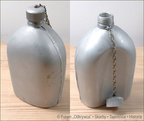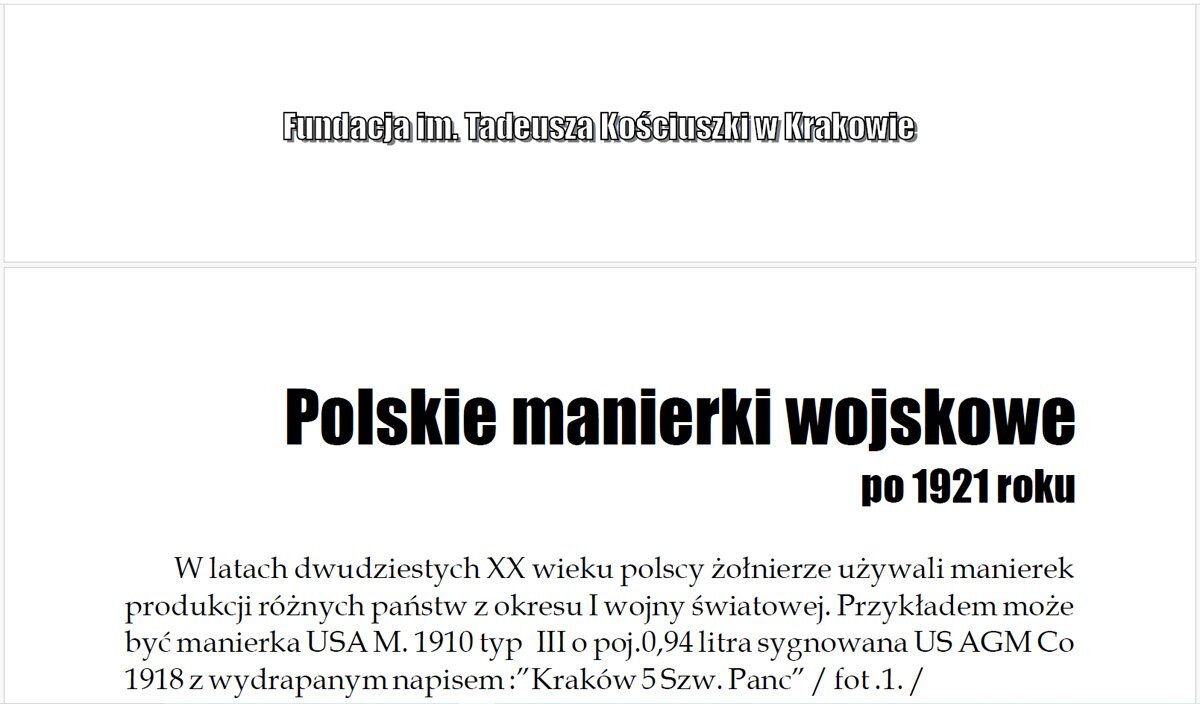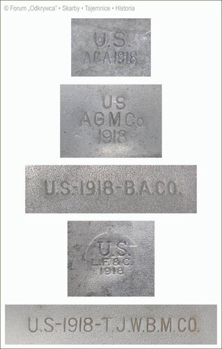 5 Manierka M1910 – piąta odmiana, jaka mogła trafić do WP Począwszy od roku budżetowego 1918 Ostatnia odmiana manierki M1910 to odmiana podobna do odmiany czwartej. Nowoczesnych aluminiowych manierek nadal w amerykańskich siłach zbrojnych brakowało, zatem w roku budżetowym 1918 zdecydowano, że odtąd manierki takie będzie produkowało pięć firm z sektora cywilnego. Miały to być firmy Aluminum Company of America, Aluminum Goods Manufacturing, Buckeye Aluminum, Landers, Frary & Clark i The J.W. Brown Mfg. Co. Każda z tych manierek miała szansę trafić do Wojska Polskiego, ponieważ jak wskazuje rok budżetowy 1918 ich produkcja ruszyła 1 lipca roku 1917. Jednocześnie na przełomie lat 1917/1918 zapadła decyzja, że odtąd każdy przedmiot dla amerykańskich sił zbrojnych musi być cechowany symbolem państwowym „U.S.”, nazwą producenta i rokiem budżetowym. W tym czasie technologia spawania aluminium była już powszechna w Stanach Zjednoczonych. Cała piątka producentów wykonywała więc manierki tanio i w prostej technologii, jak z manierek numer 2 i 4. Manierka • odmiana pierwsza Producenci: pięciu wyżej wymienionych Materiały: Aluminium i nowe srebro Technologia: tłoczenie dwuczęściowego korpusu i spawanie Gwintowana szyjka: tuleja z nowego srebra ze stałym kołnierzem do mocowania łańcuszka Mocowanie łańcuszka do szyjki: stałe Cechowanie rokiem budżetowym: Tak Cechowanie nazwą producenta: Tak Kubko-menażka – tłoczona z blachy aluminiowej z uchwytem z nowego srebra. Manierka • pododmiana druga Producenci: pięciu wyżej wymienionych Materiały: Aluminium i nowe srebro Technologia: tłoczenie dwuczęściowego korpusu i spawanie Gwintowana szyjka: tuleja z aluminium ze stałym kołnierzem do mocowania łańcuszka Mocowanie łańcuszka do szyjki: stałe Cechowanie rokiem budżetowym: Tak Cechowanie nazwą producenta: Tak Na fotografii poniżej: Manierka M1910 firmy Landers, Frary & Clark cechowana rokiem budżetowym 1918. Jest to rzadszy egzemplarz z szyjką aluminiową, ponieważ większość manierek z tej serii miała szyjki z nowego srebra. Manierki takie są w Polsce znajdowane w m.in. miejscach bytowania przedwojennego WP. Wspominałem kiedyś dawno w innym wątku, że ćwierć wieku temu z Panem Tomaszem Otrębskim rozmawialiśmy o napisaniu czegoś o manierkach WP. Moim zadaniem miało być opisanie tych amerykańskich. Jakoś ówcześnie temat nam się rozmył, ale Pan Tomasz przysłał mi wtedy swój wcześniejszy tekst o manierkach, jaki miał w pdf-ie. Poniżej mały fragment tego tekstu. I na zakończenie analiza kolegów-forumowiczów, z jakiej jednostki WP powyższa manierka się wywodziła.
