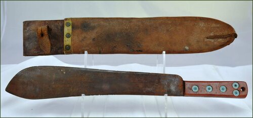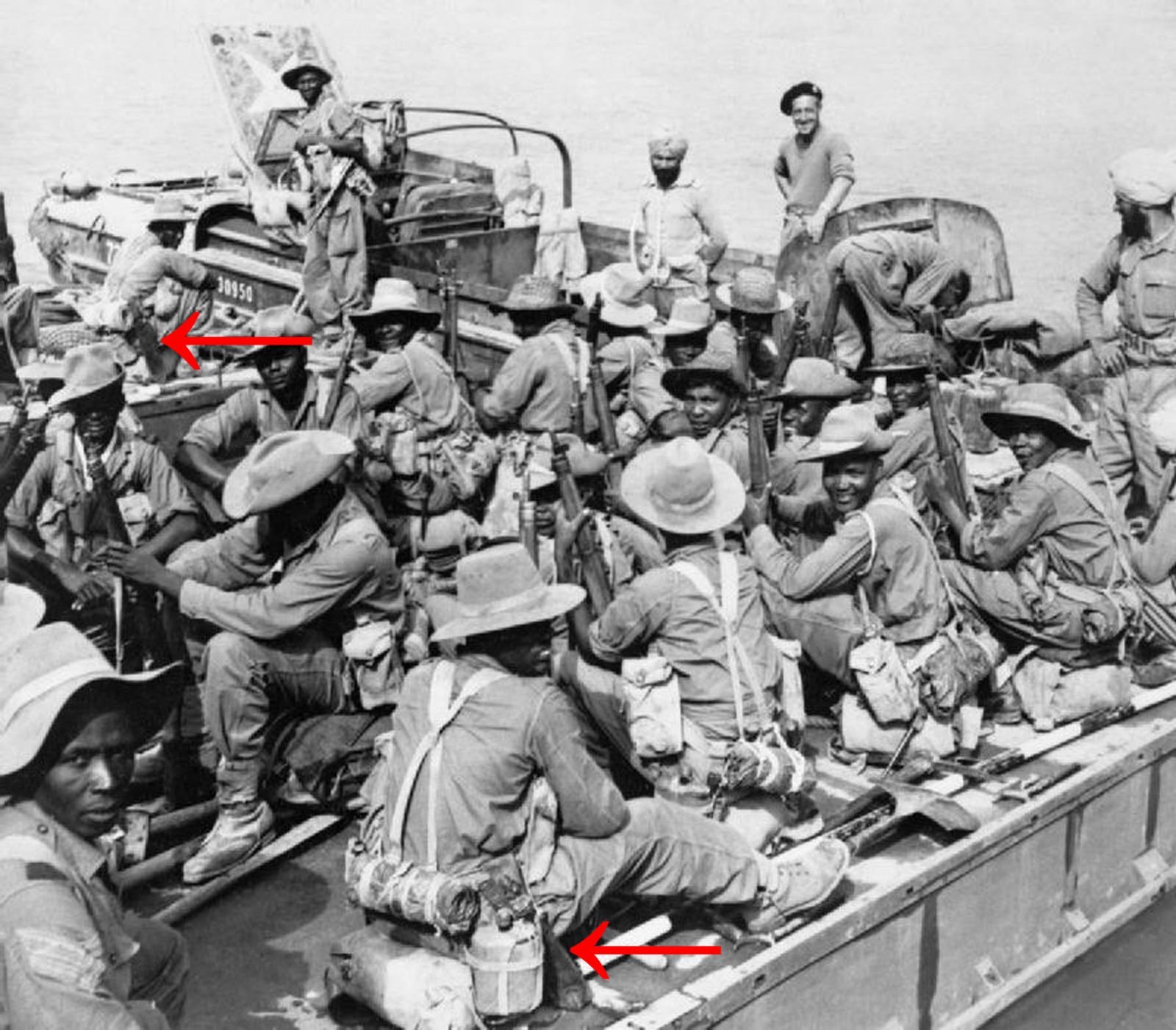 Czas na sprzęt rdzennie brytyjski, a nie tylko trzymany w dłoniach przez Brytyjczyków lub innych commonwealthowców. Na front SEAC Wielka Brytania też wybrała się ze swoim wojskowym narzędziem, które nieco wymyka się prostej definicji - można powiedzieć, że to trochę dłuższe bolo, albo że to trochę krótsza maczeta. Poniżej są żołnierze 11. Dywizji Piechoty zwanej dywizją wschodnioafrykańską. Na tej fotografii w grudniu 1944 roku właśnie forsują rzekę Czinduin w Birmie na wysokości miasteczka Shwegyin. Żołnierze są wyposażeni w brytyjskie maczety wojskowe. Zaznaczyłem je czerwonymi strzałkami. Poniżej taka właśnie brytyjska maczeta cechowana datą produkcji 1944. Wyprodukowała ją firma Ralph Martindale & Company Ltd. - ikoniczna dla Brytyjczyków firma branży maczet istniejąca od roku 1874 do dziś i przez cały ten okres produkująca maczety dla sił zbrojnych Wielkiej Brytanii i szerzej dla Commonwealthu. Pochwę do poniższej maczety wyprodukowała brytyjska firma D. M. & S. Ltd. specjalizująca się w wyrobach skórzanych dla wojska. -