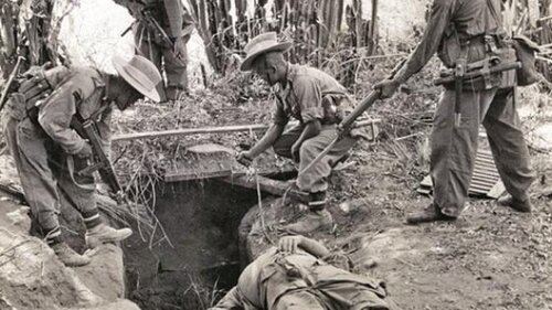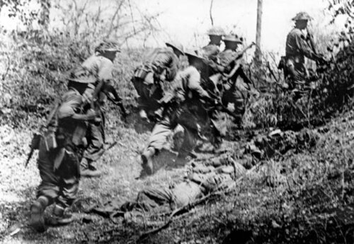 Tu z kolei ciekawostka z oddziału brytyjsko-gurkhowskiego. Oddział walczy 19 km od Meiktili w Birmie. U żołnierza pierwszego z lewej nie widać broni palnej (może trzyma ją lewą ręką i ciało zasłania tę broń) za to w prawej dłoni trzyma kukri. -