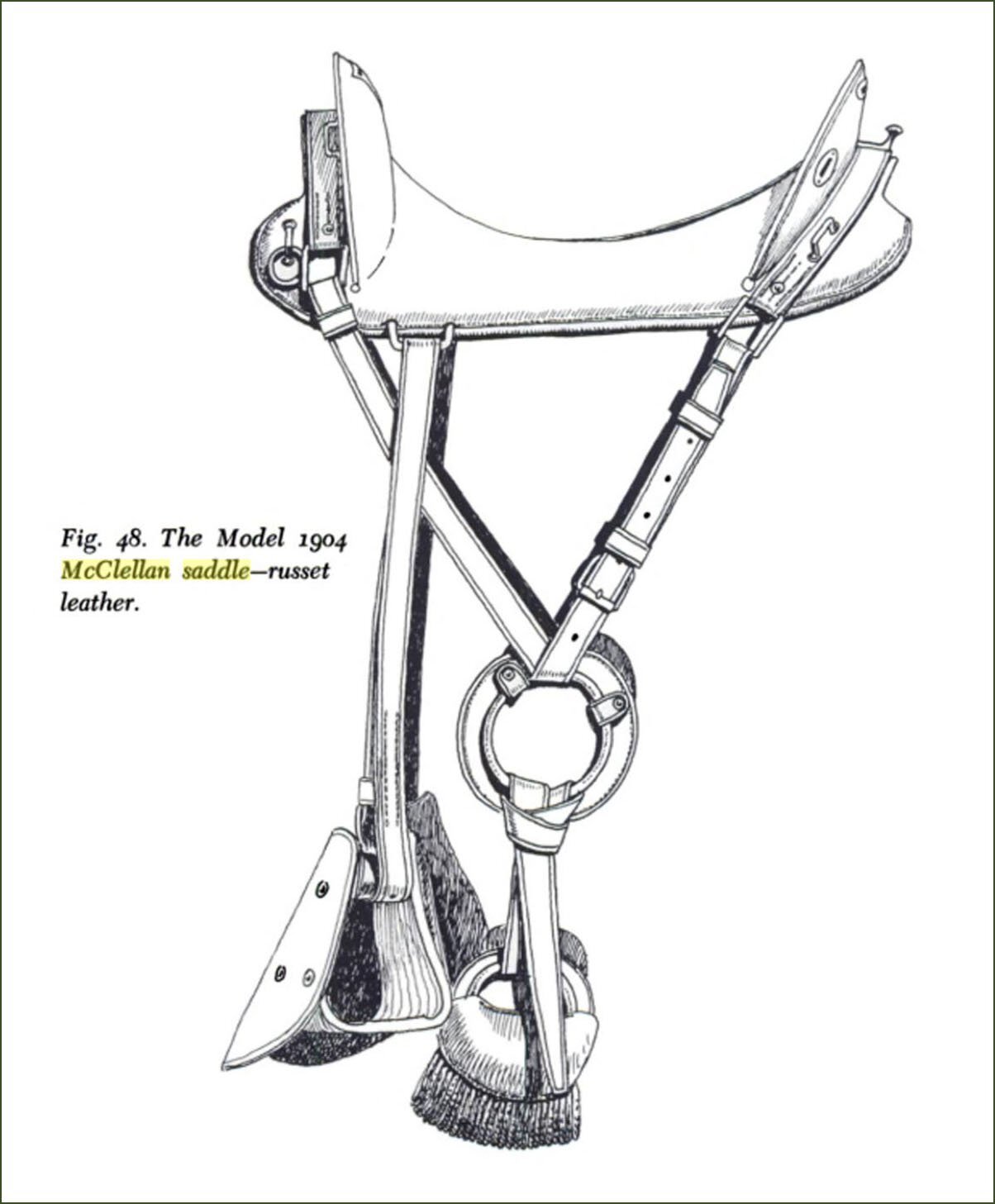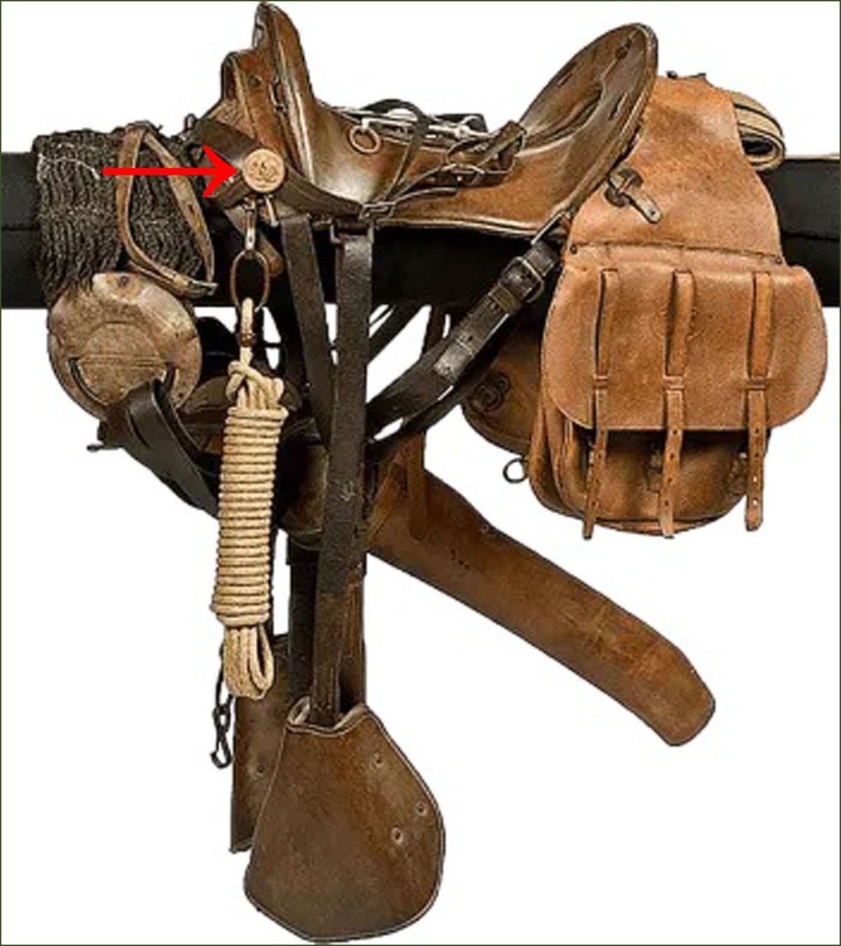 Teraz siodła M1904 i drobna amerykańska „falerystyka”. Pytanie jest, co, i czy w ogóle coś, Wojsko Polskie robiło z poniższymi akcentami przynależności siodeł do amerykańskich sił zbrojnych? Czy były one w Polsce zdejmowane z siodeł, czy machano na te sprawy ręką i używano siodeł tak, jak dotarły nad Wisłę bez żadnych zmian? W U.S. Cavalry siodła te nierzadko nosiły symbolikę amerykańskiej państwowości. Poniżej jest siodło McClellana M1904 z zamocowanymi po obu stronach godłami Stanów Zjednoczonych w formie takich orłów, jakie nosili amerykańscy oficerowie na czapkach garnizonowych; patrz → czerwona strzałka. Poniżej jest inny rodzaj oznakowania siodła M1904 jako przedmiotu urzędowo należącego do U.S. Army. Są to mosiężne odznaki z sakramentalnym „US”, jak na prawie wszystkich przedmiotach i całym innym sprzęcie amerykańskich wojsk lądowych. Odznaki przymocowane są z tyłu po obu stronach siodła. Jeśli ktoś wie, czy tego typu elementy amerykańskiej falerystyki były usuwane w Wojsku Polskim to informacja taka mile widziana. -