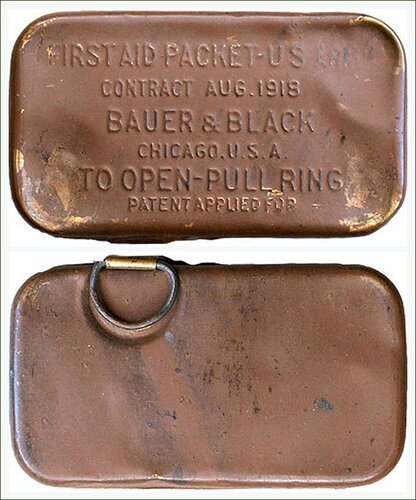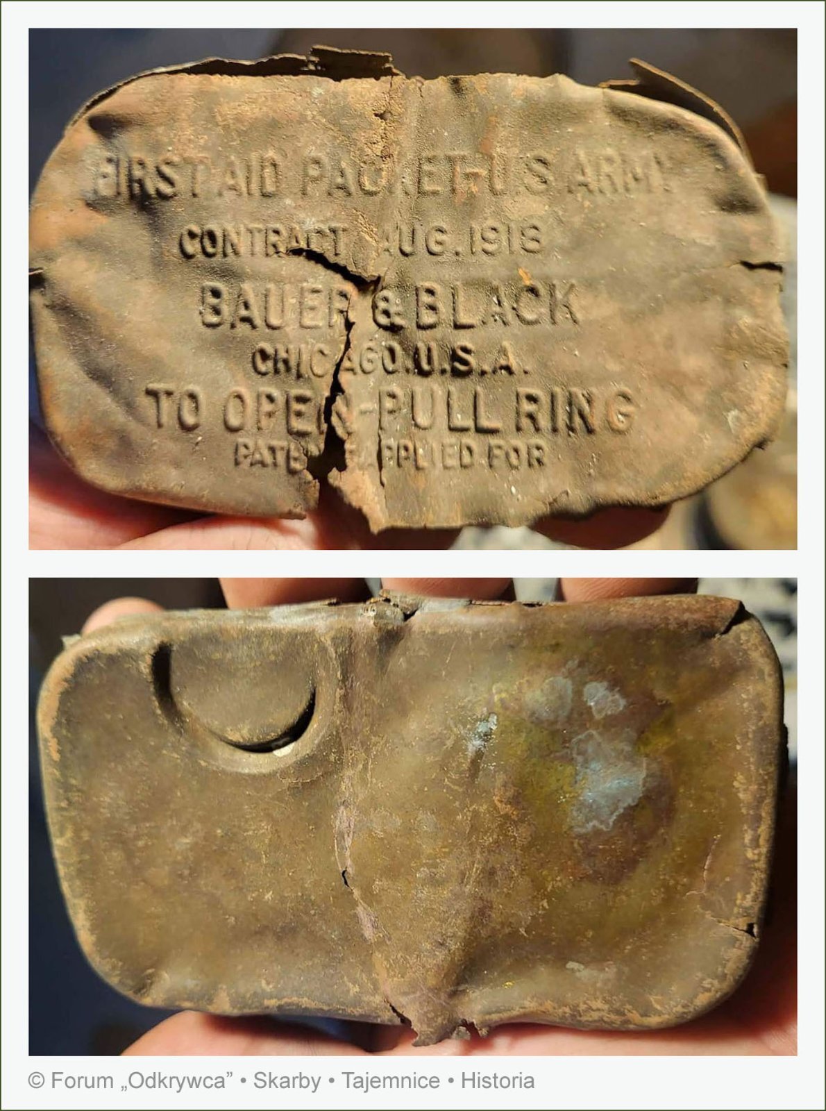 Wątek nie dość, że empiryczny to bardzo profilowy dla magazynu „Odkrywca”, a to dzięki @bjar_1 i jego koledze z wykopków, który udostępnił zdjęcia swojego eksponatu z historii WP II RP. Obu Panom bardzo dziękuję za pomoc w zredagowaniu tego wątku. Wojsko Polskie pozyskało od U.S. Army m.in. dużo rzeczy „socjalno-bytowych” oraz medycznych. Do tych ostatnich należały między innymi pakiety pierwszej pomocy opracowane w Stanach Zjednoczonych w roku 1904 i natychmiast przyjęte na wyposażenie wojska, ponieważ wnosiły nową jakość w higienie pomocy i samopomocy medycznej. Pakiety w mosiężnych puszkach zawierały dwa sterylne opatrunki osobiste i dwie duże, wygodne w użyciu nawet w stresie, agrafki. Całkowitą czystość i sterylność opatrunków zapewniała puszka otwierana dopiero tak, jak konserwa, co gwarantowało szczelność opakowania. Do końca I wojny światowej wyprodukowano kilka milionów tych pakietów i kontrakt na tę produkcję miała chicagowska firma Bauer & Black. Sterylne puszki były produkowane w dwóch wersjach kolorystycznych, jak poniżej. Bardziej charakterystyczna dla użytkowników wojskowych była puszka niemalowana, a tylko z wytłoczonymi napisami. Tu przechodzimy do poniższego eksponatu wykopanego w Polsce. W innym poście tego podforum uczulałem, aby zgodnie z amerykańskimi przepisami rozgraniczać to, czym jest rok kalendarzowy, a czym rok budżetowy. Dotyczy to wyłącznie przedmiotów cechowanych tylko rokiem. W przypadku, gdy mamy cechę (stemplowaną, wybitą lub tłoczoną) z miesiącem i rokiem wówczas mowa jest o roku kalendarzowym. I taki też pakiet z sierpnia 1918 roku mamy wykopany w Polsce na stanowisku jednostki WP. Jest on ciekawy podwójnie. Po pierwsze – jest materialnym dowodem, że WP pakiety takie miało. Po drugie – jest to pakiet, który dotarł do Europy grubo po zakończeniu I wojny światowej, co z kolei dowodzi, że pozyskiwanie przez WP różnych rzeczy od U.S. Army niekoniecznie odbywało się natychmiast po zakończeniu wojny. Dlaczego powyższy pakiet z sierpnia 1918 roku z zasobów WP jest powojenny (w sensie dostawy), mimo że I wojna światowa zakończyła się 11 listopada 1918 roku? Dla obu wojen światowych amerykańscy historycy sformułowali termin „Quartermaster pipeline”, czyli „rurociąg kwatermistrzowski”, a jak dziś powiedzielibyśmy „zdolności logistyczne”. Owoż zmierzono czynnik, ile wynosi czas, od którego amerykański robotnik bierze w dłonie pierwsze narzędzie lub siada przy jakiejś maszynie, aby wytworzyć jakiś przedmiot dla wojska do chwili, gdy ten sam przedmiot docierał do okopu na pierwszej linii frontu. Ze względu na wszystkie środki transportu i wewnątrzwojskową dystrybucję czas taki wynosił minimum 6 miesięcy. Czyli powyższy pakiet polskiego żołnierza mógł dotrzeć z USA do Francji najwcześniej w lutym 1919 roku. Jeszcze raz olbrzymie podziękowania dla @bjar_1 i jego kolegi za pomoc w tym wątku, a jeśli to możliwe to jeszcze prośba o informację, gdzie ten amerykański pakiet WP został znaleziony, to może doszłoby się do tego, który pułk WP dostał takie pakiety.