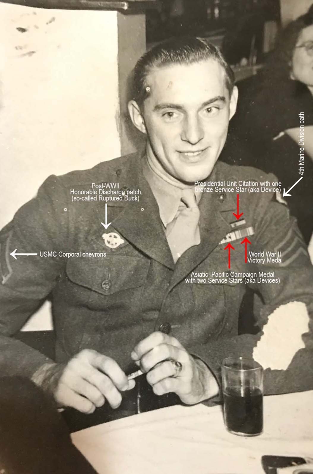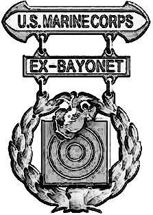 Nareszcie Korpus! W czymś żołnierz był dobry, ponieważ ma tzw. odznakę podstawową USMC, tylko nie wiadomo, z jaką przywieszką (za co). Przywieszek do tej odznaki było wtedy w USMC 16 - 8 ze statusem Expert; 7 ze statusem Sharpshooter i jedna ze statusem Marksman. Poniżej przykład tej odznaki z przywieszką fachmana od walki na bagnety. -