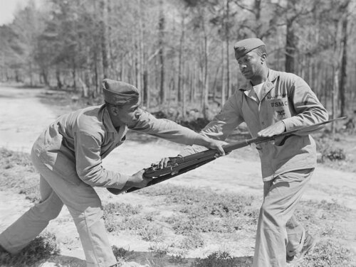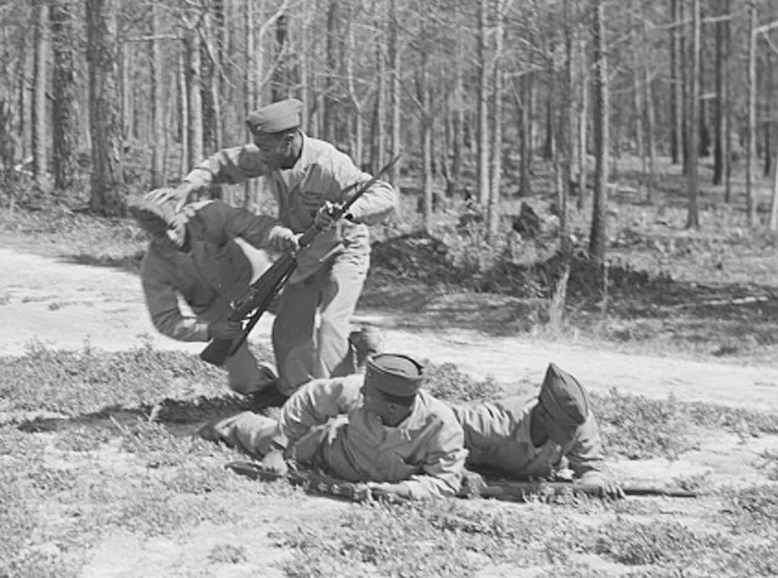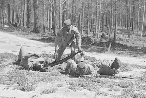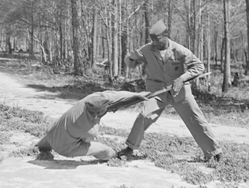 Gdy 8 grudnia 1941 roku USA wypowiedziały wojnę Japonii, a 11 grudnia Niemcom i Włochom to natychmiast pomiędzy rodzajami wojsk amerykańskich sił zbrojnych rozegrała się bitwa o pozyskanie instruktorów walki wręcz z rynku cywilnego i z rynku niewojskowych służb mundurowych. A było o co i o kogo się bić, ponieważ uprawianie sztuk walki w okresie międzywojennym nie było czymś rzadkim w USA. Uczono i trenowano m.in. judo, ju-jitsu i savate, o boksie już nawet nie wspominając, bo on był najpopularniejszy. Co ciekawe, mimo segregacji rasowej kolorowi nie byli izolowani od tych nauk, choć być może ich liczebność w tych dyscyplinach była mniejsza niż w przypadku białych. Zachowały się np. setki, jeśli nie tysiące, zdjęć z meczów bokserskich pomiędzy Grupami i Skrzydłami USAAF na wszystkich teatrach działań wojennych. USAAF miały też swoje kursy „commando”, jak je zwano, gdzie instruktorzy różnych sztuk walki uczyli ich lotników. Była na to przeznaczona baza lotnicza Bowman Field. Jak się czyta drugowojenne kwity US Navy/USMC to jednak odnosi się wrażenie, że najwięcej instruktorów różnych sztuk walki pozyskały siły lotnicze obu tych rodzajów wojsk. Albo jeśli było to sterowane odgórnie to tak tych instruktorów tam przydzielono. Będąc już na wojnie Ameryka chyba dość szybko zorientowała się, że w kulturze europejskiej nikt się nie pcha do walki na bagnety, czy do innej walki wręcz i że w cywilizacji łacińskiej jest to ostateczność wypływająca z desperacji albo beznadziejności jakiejś sytuacji frontowej. W związku z tym w US Army/USAAF oczywiście uczono walki na bagnety, ale bez szczególnej intensywności tej nauki. A w przypadku USMC było na odwrót. I dlatego polscy drugowojenni marines też musieli być w tym dobrzy, a polonijnym górnikom krzepy na pewno nie brakowało. W konfrontacji z Japonią USA szybko się zorientowały, że tutaj to nie front afrykański, włoski i zachodnioeuropejski tylko wręcz przeciwnie – tutaj skrajnie fanatyczny żołnierz japoński zindoktrynowany po praniu mózgu wręcz prze do bezpośredniej konfrontacji na bagnety i na cokolwiek innego w bezpośrednim kontakcie z żołnierzem alianckim. To, że tutaj to nie Europa, tylko kompletna dzicz z wieków wczesnych/średnich raczej szybko dotarło do decydentów marines. Dlatego w USMC na walkę wręcz kładziono inny nacisk niż w US Army/USAAF działających w basenie Morza Śródziemnego i w Europie. I nie miała tu już znaczenia segregacja rasowa. Jeśli ktoś był dobry w walce wręcz i mógł być jej instruktorem to już nie patrzono kolorowy-nie kolorowy tylko Korpus brał takich gości i uczyli wojsko czego trzeba. Poniżej wprawdzie nie przykład Polonii amerykańskiej, bo są to czarni marines, niemniej przykład obrazowy i charakterystyczny dla tego, przez co musieli w trakcie szkolenia przejść również polonijni marines. Marzec 1943, Camp Lejeune. Kapral-instruktor walki wręcz – pozyskany z policji, gdzie był trenerem judo – gołymi rękami po kolei kładzie żołnierzy atakujących go karabinami z bagnetami. Polonusi w USMC, jak wszyscy, musieli przechodzić przez to samo.