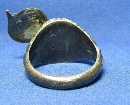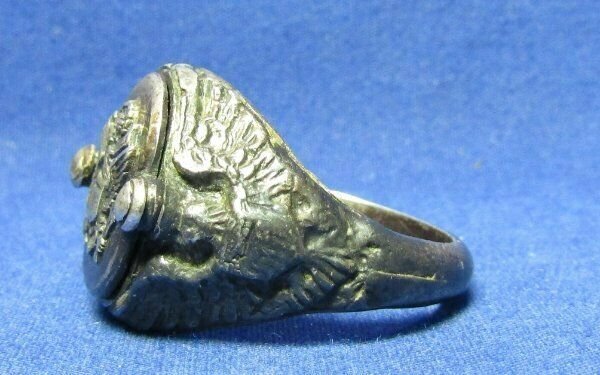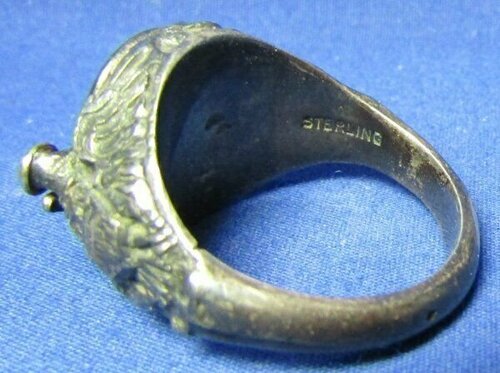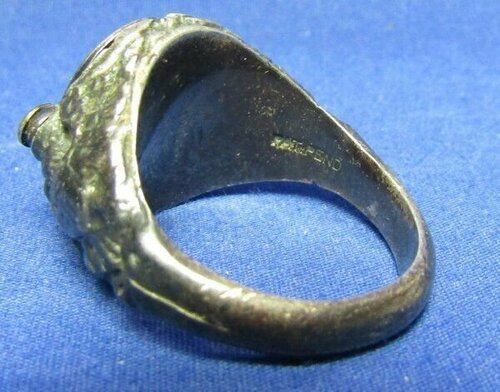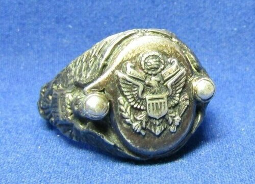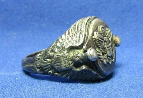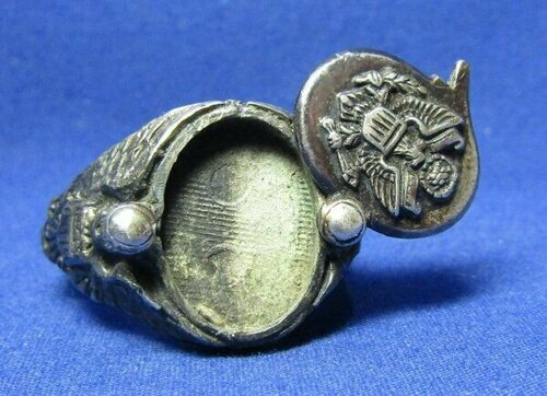 A tu - jak się ostatnio ładnie utarło na forum - zdjęcia dla potomności, żeby było wiadomo, jakie siupy robili sobie amerykańscy wytwórcy takich patriotycznych sygnetów. Nie, to nie jest sygnet ani dla któregoś z muszkieterów, ani dla kardynała Richelieu do skrytobójczych rozpraw z wrogami poprzez dosypywanie im trucizny z sygnetu do wina. To klasyczne US sweetheart jewelry tym razem ze srebra (stop Sterling, czyli srebro próby 925).