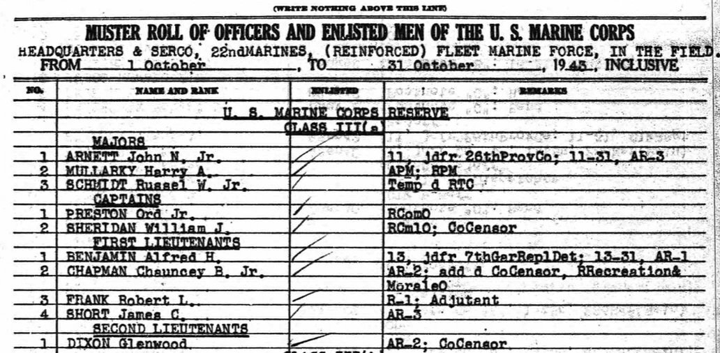 I tak jest z każdą kompanią USMC, batalionem, już nie mówiąc o pułkach i dywizjach Marines. Jakiego Muster Roll by się nie wzięło to wszędzie są polskie nazwiska - zamerykanizowane lub nie. Poniżej fragment Muster Rollu 22. pułku USMC za okres 1-31 października 1945 roku. Major Harry A. Mullarky to prawdopodobnie polonus.