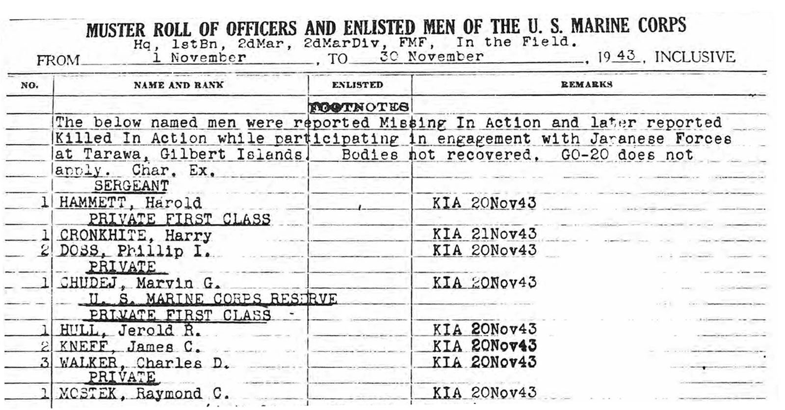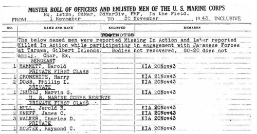 Nie każda polska rodzina miała szansę pochowania swojego syna i odwiedzania jego grobu. Poniżej jest fragment kolejnego Muster Rollu - tym razem 1. batalionu 2. pułku 2. Dywizji USMC za okres 1-30 listopada 1943 roku. Wyszczególnieni są żołnierze, których początkowo kategoryzowano „zaginiony w akcji”, a finalnie jako „poległy w akcji”. Ciał nie odnaleziono. Zakładam, że szeregowcy Marvin G. Chudej i Raymond C. Mostek to Polonia.