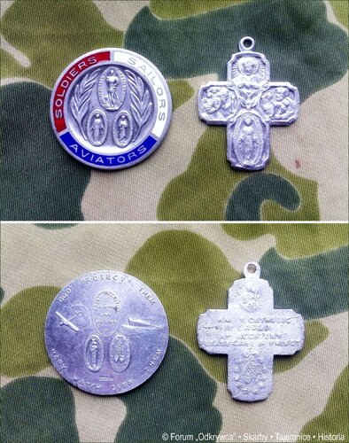 Mały przegląd tych wojskowych dewocjonaliów, jakie należały się amerykańskim żołnierzom od państwa. Ponieważ ks. kpt. Andrejewski to spadochroniarz, więc zaczniemy od dwóch przedmiotów spoczywających na wczesnej nylonowej czaszy spadochronowej ze spadochronu desantowego z omawianych czasów. Nikt nie policzył tego (i wątpię, aby policzył), ile wzorów tych dewocjonaliów od państwa amerykańskiego powstało podczas II wojny światowej. Żołnierze mogli je kupować w wojskowych sklepach Post Exchange (PX), mogli je dostawać od pułku, albo mogli je dostawać od kapelanów - wszystko zależało od płatnika pułku i na co pułk w danej chwili było stać. Grawerom-medalierom państwo jakoś specjalnie nie narzucało designu tych dewocjonaliów, ale narzucało stosowanie trzech barw amerykańskiej flagi oraz to, żeby napis SOLDIERS był na czerwonym tle; napis SAILORS na białym; napis AVIATORS na niebieskim. Zgodnie z amerykańską tradycją przedmioty te były wyrabiane ze stopu srebra Sterling, czyli ze srebra próby 925. Takie też są oba przedmioty poniższe z mojej kolekcji. W górnym owalu powyższego medalionu jest napis ST. SEBASTIAN PROTECT US. Mimo, że mam ten medalion w stanie idealnym to niestety nie mogę odcyfrować, co jest w obu dolnych owalach. Na rewersie medalionu w górnym owalu jest napis SAINT SEBASTIAN MARTYR AND SOLDIER. Nie mogę odczytać, jakie są napisy w dwóch dolnych owalach. Napisy główne rewersu są czytelne na planszy, więc ich nie przytaczam. Na rewersie krzyża jest napis: AM A CATHOLIC IN CASE OF AN ACCIDENT PLEASE CALL A PRIEST Nie można wykluczyć, że takimi poświęconymi dewocjonaliami wojskowymi służył wiernym ks. kpt. Andrejewski w 502. pułku piechoty spadochronowej, ponieważ tych dewocjonaliów produkowano bardzo dużo. A pasowały idealnie do tego, czym ks. Andrejewski musiał się zajmować, bo gdy już 502. pułk znalazł się na lotnisku startu do inwazji na Francję to tak samo mógł posługiwać wszystkim chcącym tego lotnikom IX TCC USAAF, którzy wieźli pułk do Francji. C.d.n.