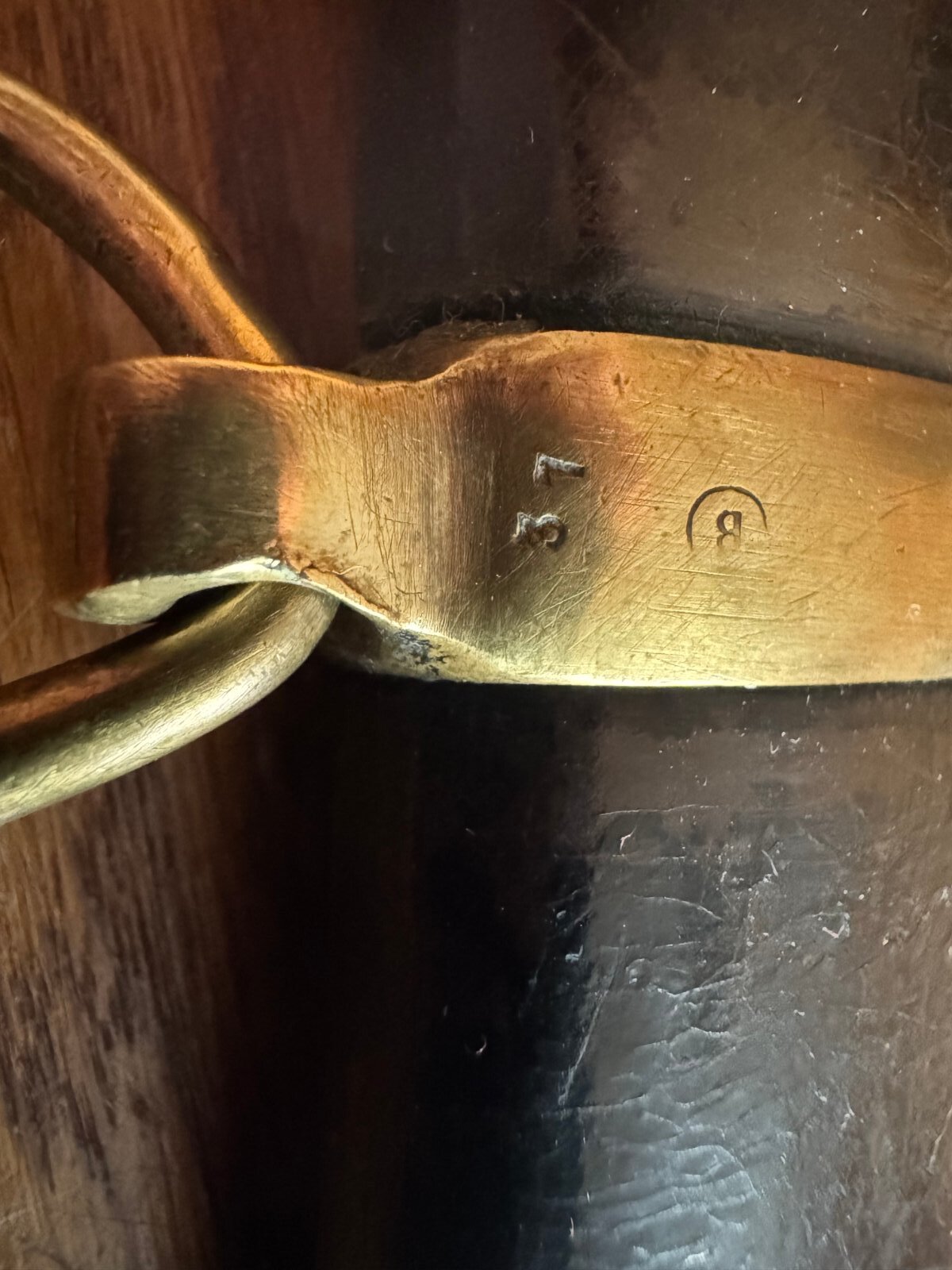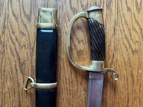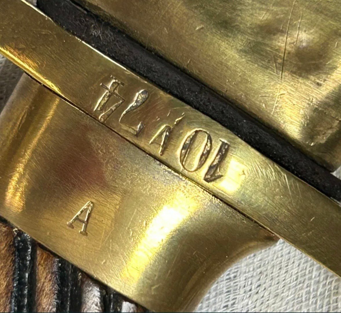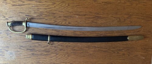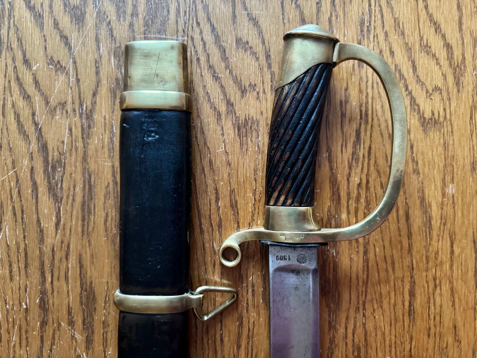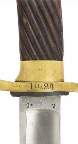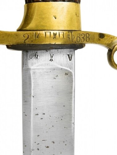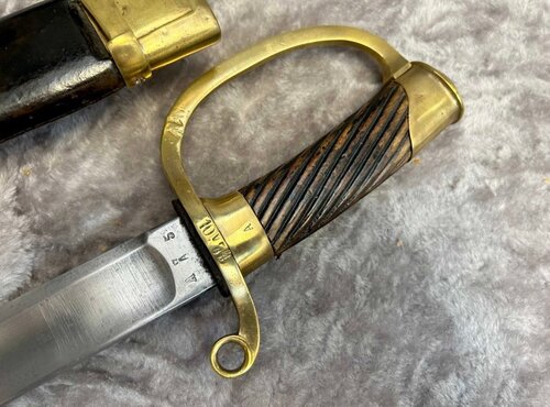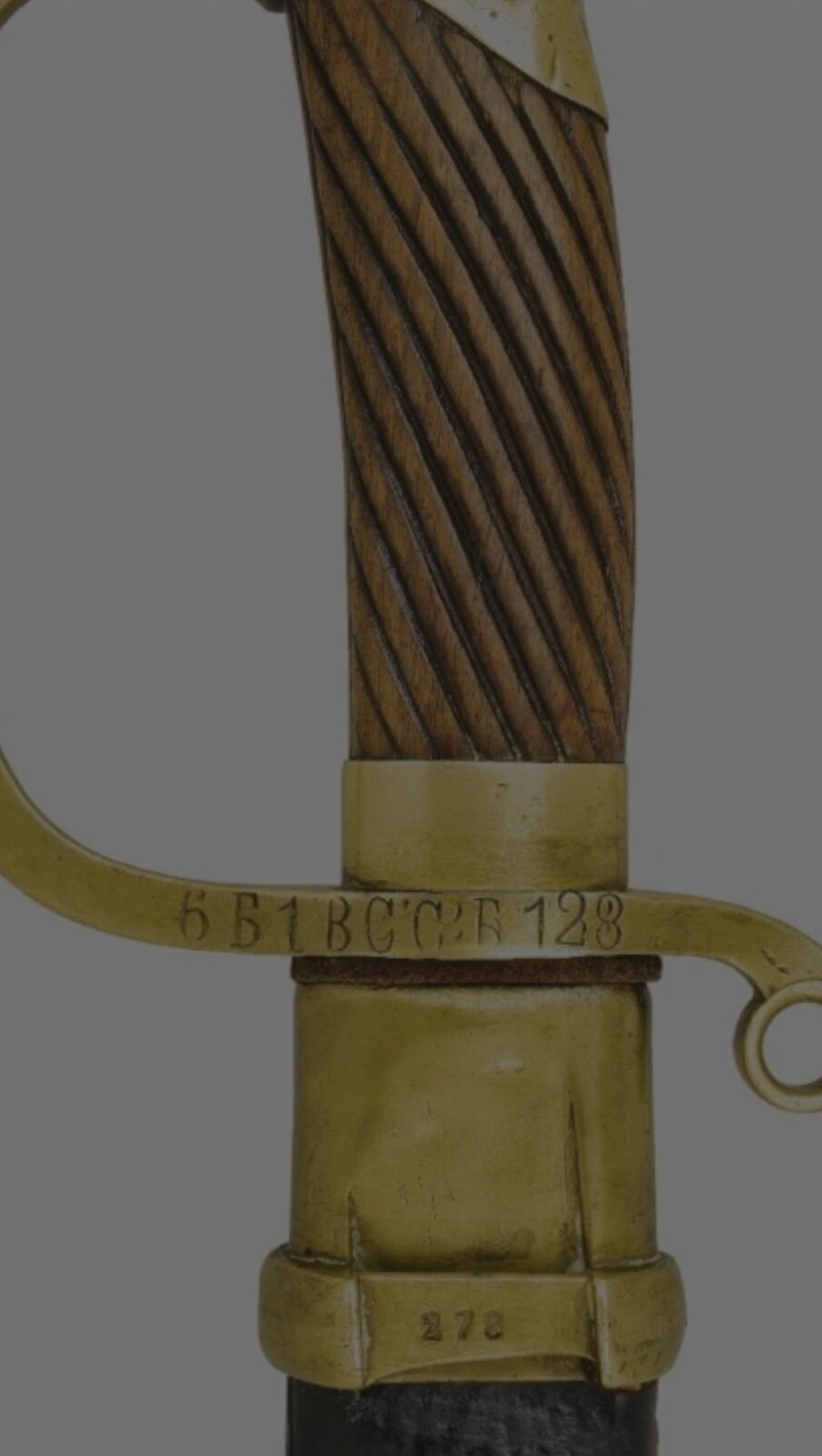 Witam wszystkich. Mam wielką prośbę. Proszę o opinię i identyfikację szabli ze zdjęć. Szczególnie sprawa dotyczy sygnatur na szabli. Pochwa z kolei nie nosi charakterystycznych bić "A", tylko "B" w owalu. Te sygnatury pojawiają się na każdym mosiężnym elemencie pochwy. Dodam, że szabla ma wymiary: długość całkowita w pochwie: 102,5 cm, długość szabli bez pochwy: 101 cm, długość samej głowni: 86,5 cm, szerokość głowni tuż pod jelcem: ok. 3,3 cm, grubość grzbietu głowni: 6 mm. Za wszelkie opinie oraz okazaną pomoc z góry serdecznie dziękuję!