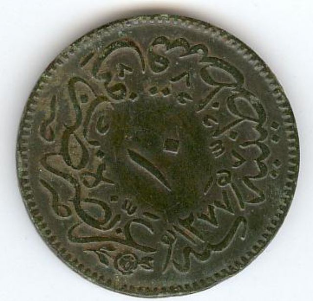 grba Napisano 4 Styczeń 2006 Napisano 4 Styczeń 2006 Moneta turecka 10 Para z roku 1277 AH (ery muzułmańskiej) tj. 1868 n.e.