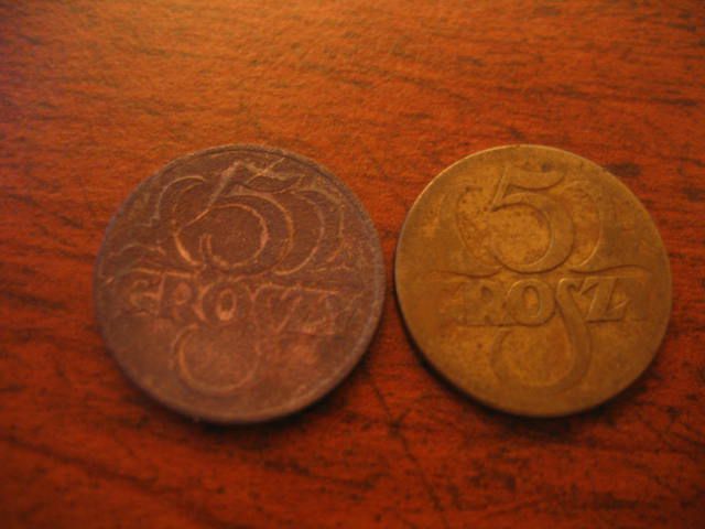 lemsoft Napisano 4 Lipiec 2005 Autor Napisano 4 Lipiec 2005 Widziecie dwie 5-groszówki z 1923 roku.Z prawej strony - oczywiste.Natomiast z lewej...?%tka z lewej leżała w dość agresywnej glebie i jest pokryta nalotem tlenku miedzi ale delikatne starcie brzegu daje ( bez podniecania się) raczej ciemny kolor brązu niż mosiądzu.Na oko widać , że moneta z lewej jest w lepswzym stanie niż mosiądz z prawej.Co zrobić aby zweryfikować tezę, że ta z lewej jest z brązu bez znisdzczenia monety??