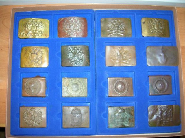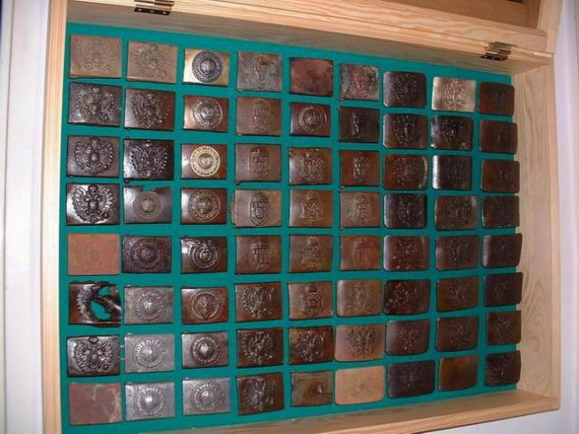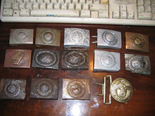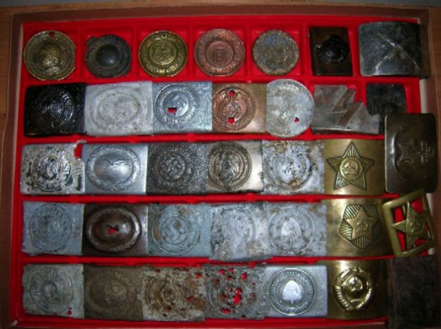danieloff Napisano 7 Kwiecień 2006 Napisano 7 Kwiecień 2006 Zdjęcie Nr 2:1 rząd:polska od pasa salonowego"/pruska oficerska (bez monogramu)/landowa Dolny Śląsk/landowa Gdańsk/niemiecka kolejowa/SA wersja mała, do wąskiego paska/sowiecka strażnicza2 rząd:WH stalowa/LW alu/Polizei alu/SA/NSDAP/DJ/sowiecka szkolna3 rząd:WH alu/LW alu/Polizei stalowa/HJ stalowa niklowana/SA Wehrmanschaften/sowiecka piechotna/sowiecka marynarska4 rząd:WH cynkowa nakładana/LW stalowa spiłowana okrutnie/Polizei cynkowa nakładana/HJ alu/RAD alu/sowiecka podobno gwardyjska (ale nie jestem pewien)/sowiecka oficerska5 rząd:WH alu nakładana/LW stalowa/SS stalowa/SS stalowa (a raczej wspomnienie po nich.../RAD alu/sowiecka milicyjna