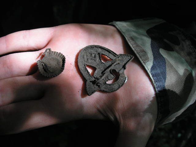 pawel_breslau Napisano 27 Czerwiec 2006 Autor Napisano 27 Czerwiec 2006 Witam.Dzisiaj wedle planów wybraliśmy się w okolice wsi pod Wrocławiem aby troszkę pobuszować w lasach i zagajnikach.W sumie mieliśmy tylko jeden lasek na myśli, do którego sie wbiliśmy.Przez pierwsze godziny nic się nie działo i nic nie znaleźliśmy ( nie licząc całej sterty komarów i chaszczy) ale po kilku godzinach bezowocnych poszukiwań...Taki oto bączek od czapki oficerskiej :)