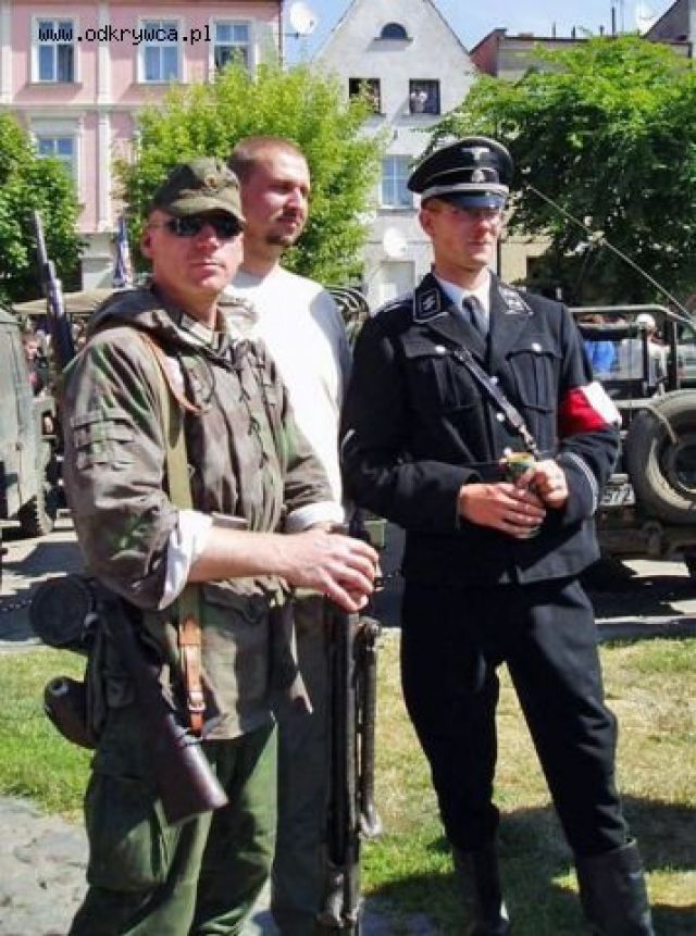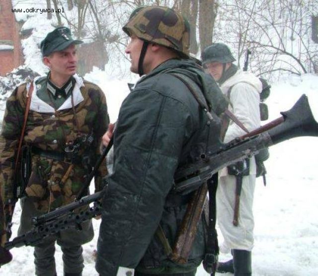 Hindus Napisano 16 Lipiec 2007 Napisano 16 Lipiec 2007 Co do obwieszania się odznaczeniami, to temat na oddzielny wątek. Ale jeżeli nawet nie wie się w jaki sposób powinno się to prawidłowo zrobić, to już świadczy albo o kłopotach ze wzrokiem (dostępnych jest przecież mnóstwo zdjęć dokumentalnych, na których doskonale widać w jakim układzie Niemcy umieszczali odznaczenia na kieszeniach mundurów), albo o braku wyobraźni przestrzennej ;)Przykładem jest załączone przez kolegę Kinioch zdjęcie – strzelec po lewej stronie ma prawidłowo przewleczoną przez dziurkę drugiego, licząc od góry guzika, wstążkę od Krzyża Żelaznego II klasy. Ale „Ogólna odznaka szturmowa” winna znajdować się POD, a nie NAD „Srebrną odznaką za rany”. Dla odmiany podoficer po prawej stronie przewlekł sobie wstążkę od KŻ II klasy o jedną dziurkę od guzika za nisko (bo widzę, że pod brodą ma jeszcze jeden nie zapięty guzik, a więc wychodziłoby, że przez trzecią, a nie drugą).Zdaję sobie sprawę, że są to drobiazgi, ale jeżeli się już decydujemy na noszenie odznaczeń to nośmy je „z głową”, bo one też są częścią wizerunku odtwarzanej przez nas sylwetki.PozdrawiamHindus