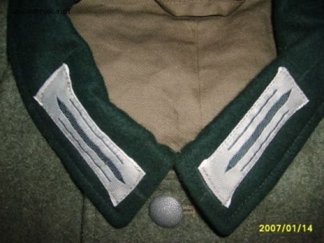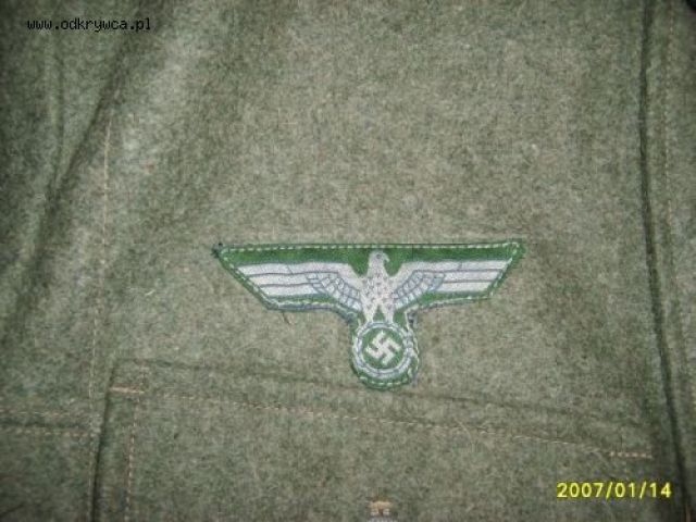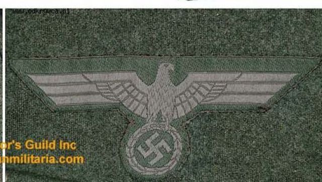 victor Napisano 14 Styczeń 2007 Napisano 14 Styczeń 2007 Tu fotka oryginalnego ptaka z kurtki M36 z germanmilitaria. Troche odbiegnę od głównego tematu watku ale skoro pojawił się też temat patek powiem co myśle na ten temat. Moim zdaniem jeżeli już chodzi o kurtki mundurowe to producenci jeszcze ja cie mogę - wybrać można ale jeżeli chodzi o obszycia to totalna porażka. A mianowice - wszystkie obszycia na czapki polowe jeżeli kupowane oddzielnie są za blisko siebie szyte, że nie można wyciąć rozetki by była w czworoboku zostawiając jednocześnie miejsce na spód adlera do przyszycia i nie ma tu znaczenia z jakiej firmy to pochodzi czy to Sturm czy inna. Wydaje mi się, że jest to spowodowane kopiowaniem wzoru z czapek z póżnieszych okresów gdzie i rozeta i orzeł były przyszywane razem.- takim też przykładem jest orzełek zaprezentowany prze kolegę robo01, wszyscy się przyzwyczailismy, że na ciemno zielonym tle a tu nie - co widac na fotografii (chyba, że orzeł jest póżniejszego wzoru do kurtem M40 i tylko naszyty na bluzę starego typu) dobrać odpowiedni kolor tła wydaje się być rzecza nader trudną dla producentów i jak to było w czasie WH jak i teraz powstaja liczne kompilacje odcieni i barw tegoż.Ogólnie kurtka kolegi jest extra, sam się do takiej przymierzam :))dodam jeszcze, obszycia - patki kołnierza są jak najbardziej parwidłowe i przewidziane do ostaniego stopnia podoficerskiego, od porucznika do obersta były patki sztywne
