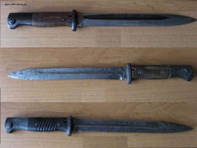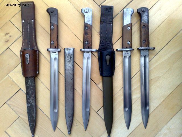 RADNORI Napisano 2 Listopad 2009 Napisano 2 Listopad 2009 To może ja też dorzucę swą małą kolekcję.Nie bardzo się jeszcze orientuję w tych fantach i może mała pomoc w rozeznaniu. Środkowy znaleziony u gospodarza używał do cięcia słomy widać ubytek spowodowany ostrzeniem, dwa pozostałe to allegro. W kolekcji jeszcze dwa liściaki-wykopki i jeden czeski do mauserka vz24.