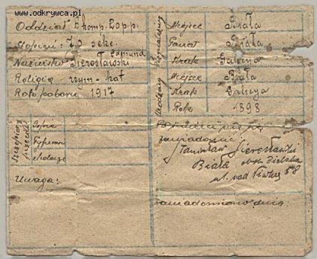 markoniec Napisano 20 Luty 2007 Napisano 20 Luty 2007 Następna wkładka, to wykonana we własnym zakresie przez właściciela karta na wzór austryiackiej. Wielkości 10,2 x 8,5 cm. Co ciekawe trafiła do mnie w blaszce austr. wzoru, więc nie wiem czy można uznać ją za czysto polską. Rok poboru 1917, ale stopień posiada: J.O.(prawdopodobnie jest to O") sekc. sekcji, sekcyjny - nie wiem jak to rozszyfrować w 6 komp. 20p.p. Skłaniałbym się do wniosku że posiadacz służył w WP.