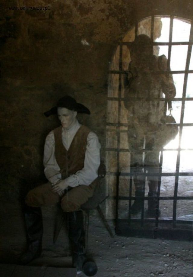 Ok jest i fota. Wejścia, kraty, gościa stojącego z torbą foto nie ma fizycznie na zdjęciu to tylko odbicie od szyby ustawionej pomiedzy. Jest tylko manekin w kapeluszu z kulą u nogi i ściana.