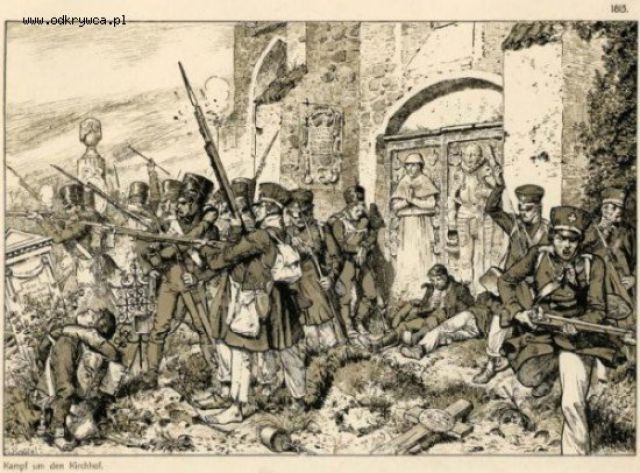 LEWY Napisano 1 Wrzesień 2007 Napisano 1 Wrzesień 2007 Potyczka z 1813 roku. Teren przykościelny, widoczne fragmenty cmentarza. Bardzo charakterystyczne nagrobki w ścianie kościoła, pochodzące zapewne z przełomu XV i XVI wieku. Świątynia wykonana, przynajmniej częściowo, z kamieni polnych. Przypory, strzeliste gotyckie okna. Przyparci do muru żołnierze są ostrzeliwani także przez artylerię (w tle widoczna eksplozja pocisku armatniego w górnej części kościoła). Czy ktoś wie co to za miejsce? Na pewno nie jest to Kurów Wielki ani Jakubów, bo też osobiście sprawdzałem...LEWY