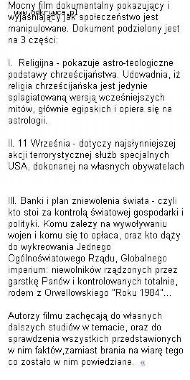 lain Napisano 21 Październik 2007 Autor Napisano 21 Październik 2007 http://video.google.com/videoplay?docid=-5870901554543719947&total=100&start=80&num=10&so=0&type=t100_pol&plindex=87Jestem nadal w szoku bo obejrzeniu tego dokumentu.Opis ze strony dokleiłem z boku.Co o tym sądzicie?pozdrawiam.