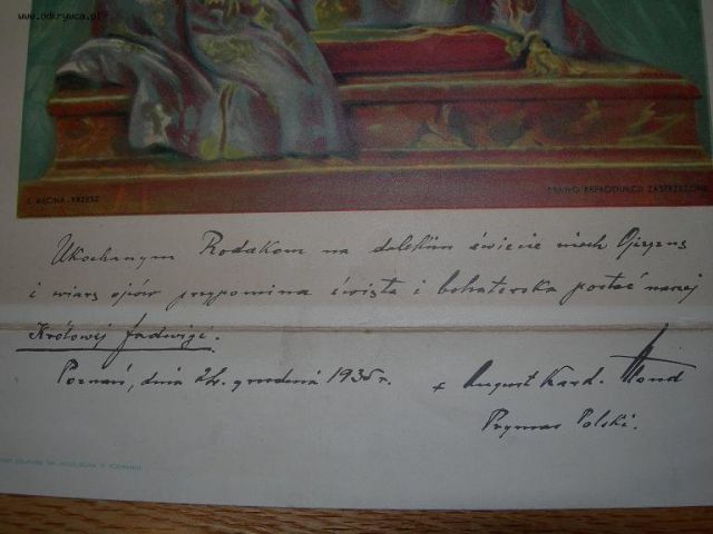 jfkl Napisano 28 Styczeń 2009 Napisano 28 Styczeń 2009 Rok temu w Kanadzie w sklepie z uzywanym szmelcem" nabylem za $2 obrazek ,potrzebowalem ramki.W domu po wyjeciu obrazka z ramki zauwazylem ze jest on zagiety na spodzie - ktos , kiedys oprawil go w przykrotka ramke(widac to na zdjeciu - kilka cm.na dole bylo podgiete)Rozprostowalem , czytam i oczom nie wierze ......Dedykacja Prymasa Hlonda...Pozdrawiam , Jan.