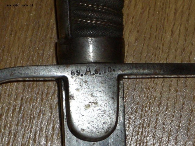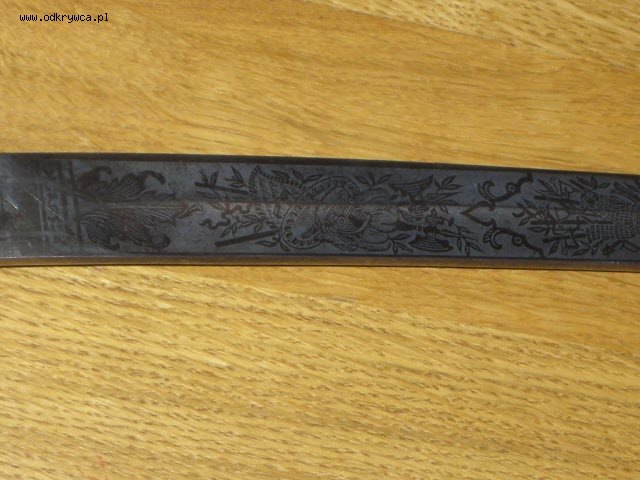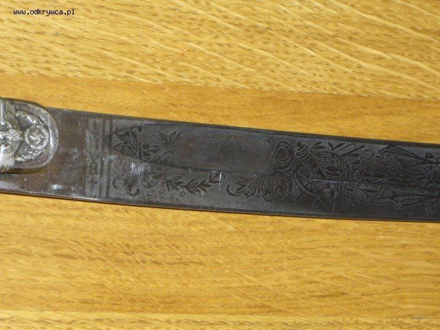 Co dziwne posiada bicia, które wyglądają jak bicia regimentowe z okresu I wojny - 69.A.6.10. - ale może się mylę. Tarczka z wroną jest też jakby przymocowana póżniej. Na głowni widoczne piękne grawerowania (trawienia?) - elementy herbowe, artyleryjskie, zbroje rycerskie.