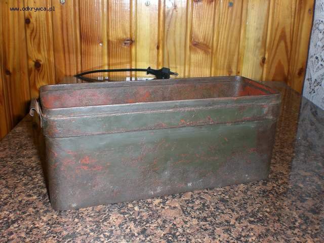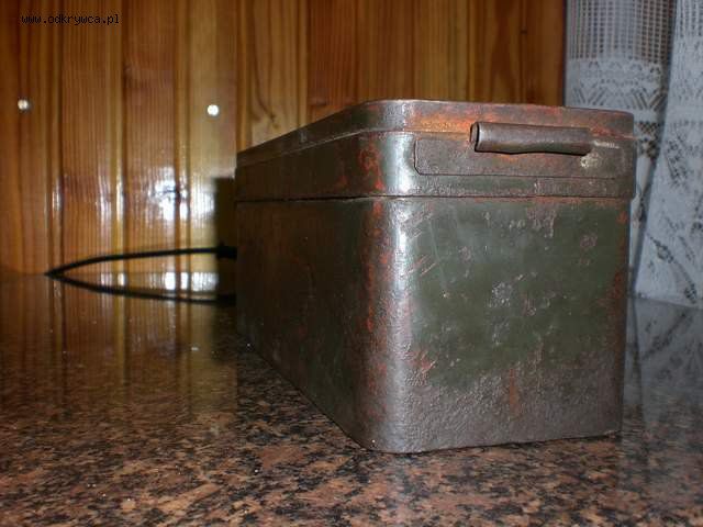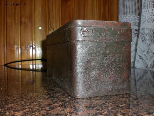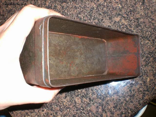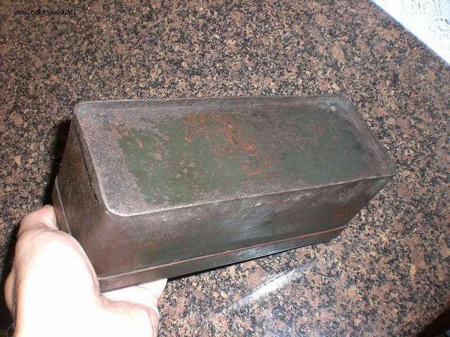 bjar_1 Napisano 12 Wrzesień 2008 Autor Napisano 12 Wrzesień 2008 Proszę o ID tego pudełka, znalezione na skupie złomu z którego mam już sporo polskich fantów...Blacha stalowa, podkład minia, na to polskie khaki.Długość : 21 cm,szerokość : 7,5 cm,wysokość : 8,4 cm.