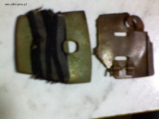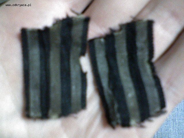 Cześć, takie skrawki wstążki dziś wykopałem. Były przymocowane do metalowej blaszki która jest na zdjęciu.Wszystko z jednego dołka.