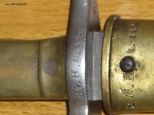 Witam Mój nowy nabytek - ale nie wiem do końca co to jest? Wygląda jak skrzyżowanie kilku modeli. Pewne cechy jak M71, inne jak M60 (fizylierów). Inne wymiary. Bicia Alex Coppel Solingen i Erfurt pod Koroną. Bicia regimentowe 84.R.9.49 na jelcu. Na pochwie 2R.R.4.140 i dwa różne bica z koroną. Długość bagnety 597mm, głownia 468mm, średnica wewnętrzna pierścienia 18mm. Jak widać na fotkach rękojeść jest z obu stron gładka anie karbowana jak w M60 czy M71. Pochwa skórzana z mosiężnymi okuciami. Może ktoś ma pomysł? Dzięki za każde info. Pozdro