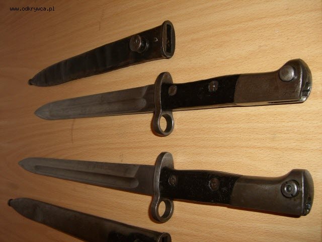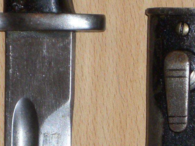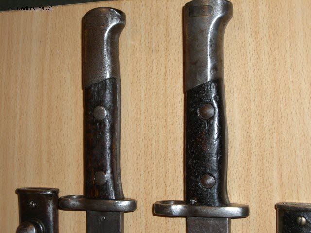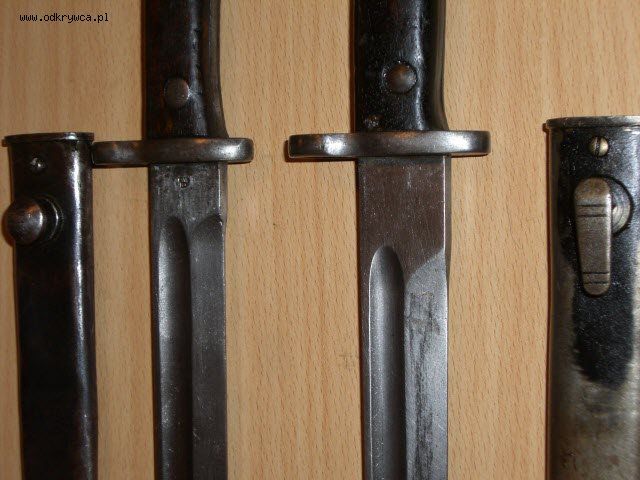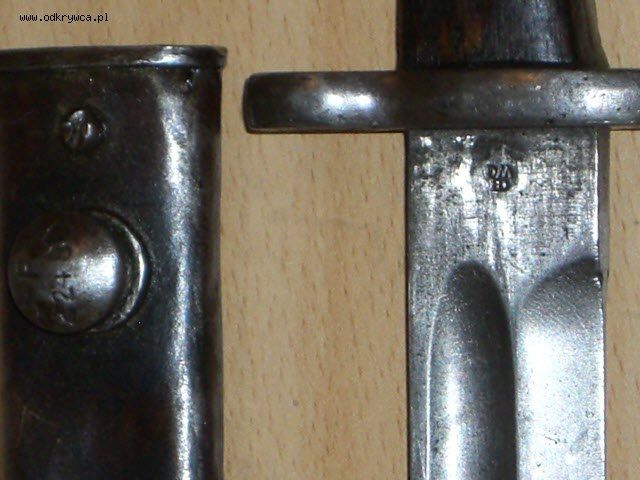 Krótszy to jakiś austriacki- podobny do modelu 1888 lub 1895, ale nie zgadza się długość - ten ma 384mm. Bicia OEWG na głowni i F22508 na wierrzchu głowicy. Do tego okrągły zaczep żabki sygnowany F22480.