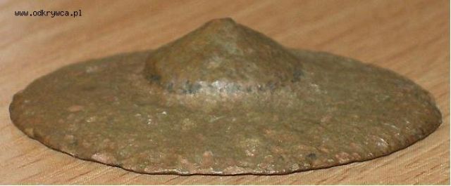Mj Napisano 21 Listopad 2008 Autor Napisano 21 Listopad 2008 Witam kolegów.Ledwo wróciłem z roboty od razu na forum, a tu taka niespodzianka. W końcu cosik się ruszyło.A teraz dodam trochę wyjaśnień.No to od początku.Na na samym wierzchołku stożka jest małe wgłębienie widoczne na zdjęciu 2 i nie wygląda ono na przypadkowe.Na rewersie natomiast są napisy na 100%(może na fotkach tak tego nie widać ale są).Kiedy dostałem ten przedmiot cały był pokryty patyną,ale oczywiście zżerała mnie ciekawość co jest na nim napisane i musiałem go przeczyścić przy użyciu rusznikarskiej substancji.Szlag mnie tylko trafia, że dałem rewers do wypiaskowania bo tandetnie to teraz wygląda-tylko proszę nie komentować:)Jeśli chodzi o fotki to w wolnej chwili postaram się zrobić w świetle dziennym i jeszcze lepsze, a co do napisów to wyglądają tak jakby cały przedmiot był kuty wokół liter(wszędzie wokół nich widać delikatne nierówności i wgłębienia).Jeśli chodzi o kropki to mi się wydaje, że są ona pomiędzy trzema literami w dolnej części.Co do koncepcji z umbo to też o tym myślałem ,ale w muzeum odrzucili ten pomysł właśnie ze względu na napis i rozmiar przedmiotu.Jeśli natomiast chodzi o pieczęć to też świtało mi to w głowie, ale gdy pokazałem to kolesiowi, który się na tym trochę zna powiedział, że napis na pieczęci byłby wybity w lustrzanym odbiciu-logiczne prawda?Chyba odp na wszelkie pytania, które padły z Waszej strony. Cholernie wszystkim dziękuję za pomoc i zaangażowanie.Pozdrawiam.Nie odpuszczę jednak dopóki nie dowiem się co to jest i co jest napisane.Gdybyście jeszcze na coś trafili pamiętajcie o mnie:)Może w niedzielę uda mi się wrzucić lepsze foty.