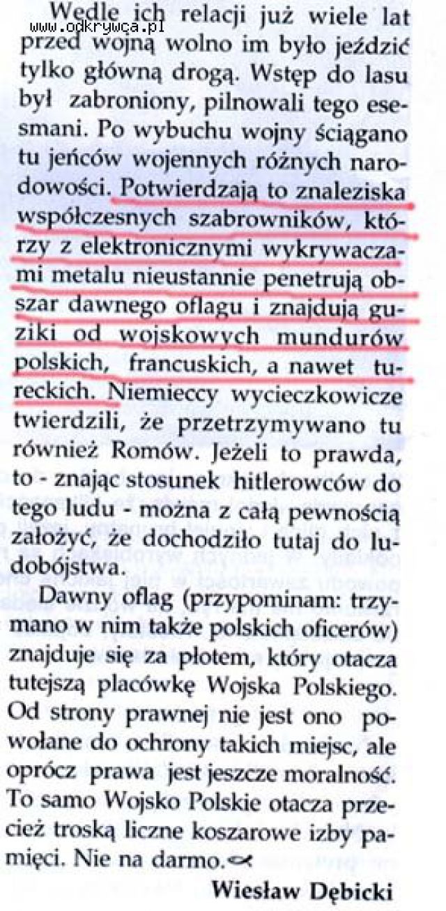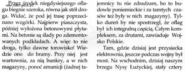 balans Napisano 27 Grudzień 2008 Autor Napisano 27 Grudzień 2008 W ramach poświątecznego odpoczynku odrabiałem zaległości prasowe i tak przeglądając lipcowy numer Wędkarza Polskiego" trafiłem na artykuł Wiesława Dębickiego pt. Od Pieńska do Łęknicy, ale całkiem mało o rybach". No i czytam sobie o tej Nysie Łużyckiej i czytam, aż natrafiłem na fragment dotyczący Przysieki, a w nim o tajemniczych poniemieckich unkrach" na terenie tamtejszej jednostki Wojska Polskiego, no i o rozkopanym przez współczesnych szabrowników" terenie dawnego oflagu, o odkopanej niemałym wysiłkiem zresztą jakiejś piwnicy i o jakiś tajemniczych szybach wentylacyjnych, czy też studniach.Pozwoliłem sobie zeskanować fragment artykułu, zdjęcia są niepodpisane, więc pewnie ich autorem jest p. Wiesław Dębicki.Pewnie są tu na forum osoby bywające/mieszkające w tamtej okolicy, ciekawy jestem ich zdania, bo w wyszukiwarce nic nie znalazłem na temat Przysieki. A może Redakcja się zainteresuje tamtejszymi unkrami"?Pozdrawiam