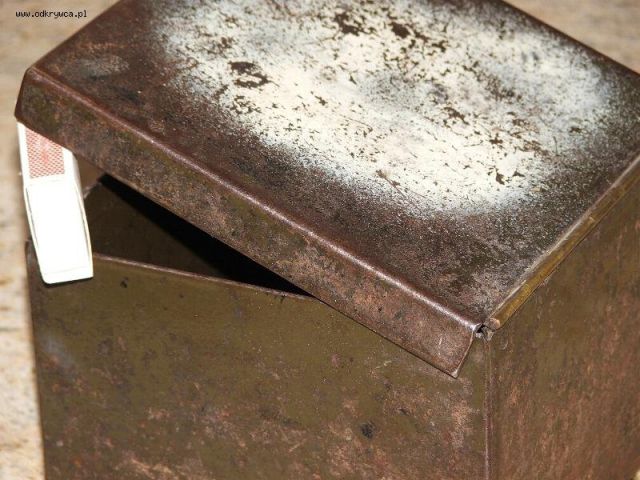 PiotrRadz Napisano 18 Luty 2009 Napisano 18 Luty 2009 Wspomniana kasetka, która została pozostawiona przez Strzelców Kanowskich w Gnojnie wraz z kufrem i papierami. Brak w niej zamknięcia(nigdy nie było). Dość charakterystyczne wieko. W środku nie ma przegródek. Oryginalne malowanie zachowane w cześci(ciemna zieleń- khaki). Białe ślady to współczesna robota. Pudełko podobno przez wiele lat służyło za skrzynkę na pasty do obuwia. Ktoś z rodziny właściciela chciał je upiększyć, ale na szczęście w porę został powstrzymany.