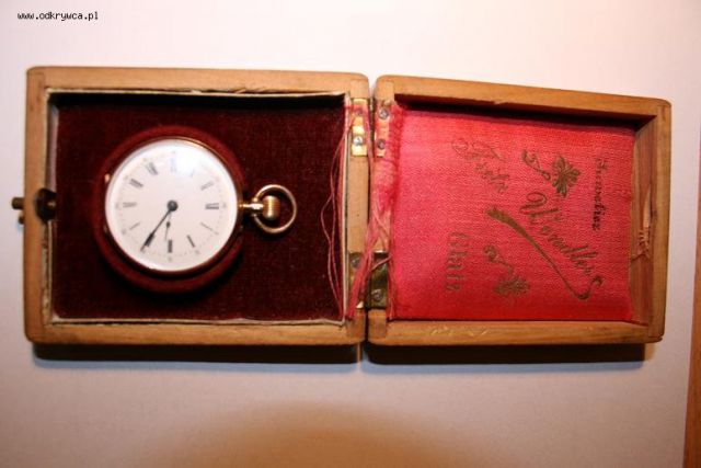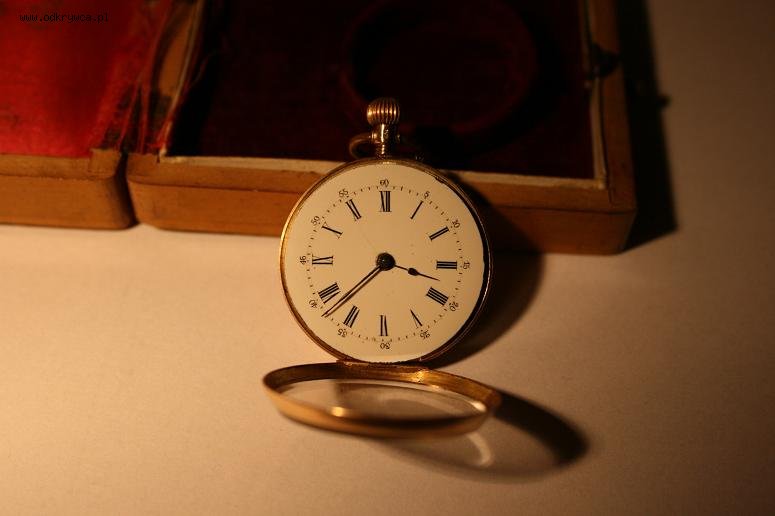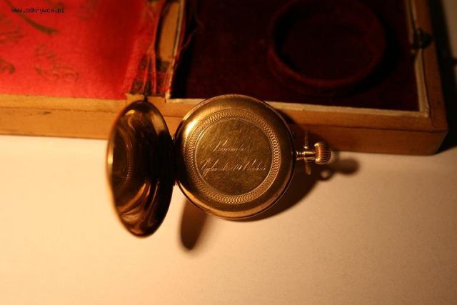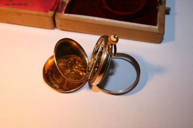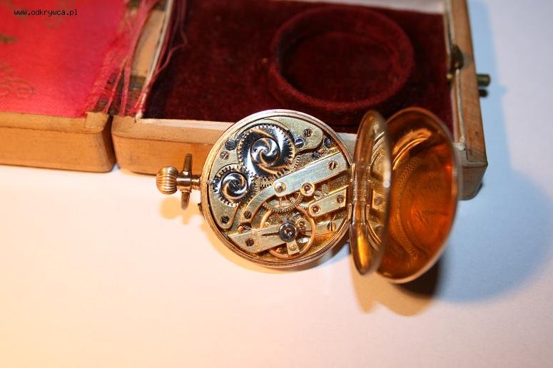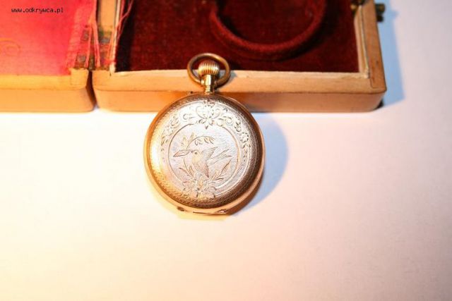 Vorax Napisano 21 Czerwiec 2009 Napisano 21 Czerwiec 2009 Kieszonkowy damski zegareczek z konca XIX wieku.Najprawdopodobniej produkcja szwajcarska na rynek niemiecki.Na pudelku beda dane domu handlowego.Fajnie ze jest oryginalne pudelko od niego rzadko sie trafia caly zestaw.Koperta wykonana ze zlota 14k czyli proba 585.Srodkowy dekiel mozliwe ze jest z mosiadzu pozlacanego.Przyjemny ptasi motyw na tylnym deklu-Pani ktora go nosila widac lubila ptaszki;).Mechanizm cylindrowy na 10 kamieniach.Tego typu ogolnie bezmarkowe zegareczki byly noszone przez klase srednia.Ladny stan zachowania-szacunkowa wartosc 500-600zl. Zakladam ze zegarek ma okolo 3 cm srednicy?Pozdrawiam Vorax