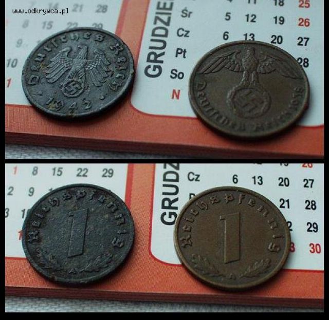 tyfus Napisano 15 Lipiec 2009 Napisano 15 Lipiec 2009 myślę, że ta teoria nie będzie idiotyczna - coś kiedys na ten temat czytałem :)otóż niemieckie monety do wybuchu wojny były bite z lepszych" materiałów, np. mosiądz - 1 pf 1938 r.w czasie wojny te lepsze" materiały poszły na inne (ważniejsze) potrzeby wojenne, a same monety zaczęto bić z mniej szlachetnych materiałów, typu cynk czy zynkal - nie wiem jak to się fachowo nazywało :) - 1 pf 1942 r. (jak na twojej focie)