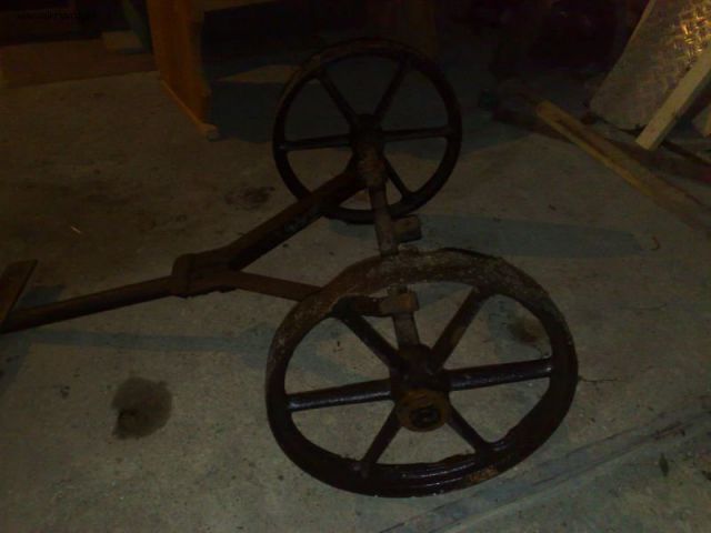 Witam, przedmiot wydobyty przy rzece Odra(opolszczyzna).Rozstaw pomiędzy kołami około 65cm. Koła wyglądają na odlew. Dziękuje za ewentualną pomoc w identyfikacji.