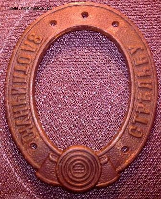 witam szanowne grono... proszę o pomoc w identyfikacji tej oto odznaki. Z napisów wnioskuje że jest to odznaka strzelecka, wykonana chyba z mosiądzu z widocznymi śladami złocenia, wymiary: szer.34mm wys.43mm... interesuje mnie w jakich latach była ona nadawana, za co i jak wyglądała kompletna bo ta kompletna chyba nie jest... oczywiście jest to wykopek... zgóry dziękuję za pomoc...