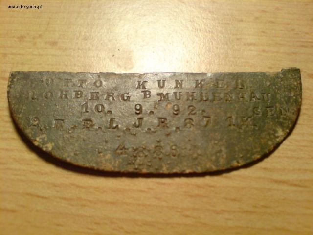 Proszę o identyfikacje nieśmiertelnika. Tekst wybity na blaszce to: OTTO . KUNKEL LOHBERG B MUHLENHAU 10. 9. 92. SEN 2. E. B. L. J. R. 371.K. 4886 Może ktoś wie do jakiej formacji należał ten żołnierz. Nieśmiertelnik znaleziony w okolicy Międzyrzecza.