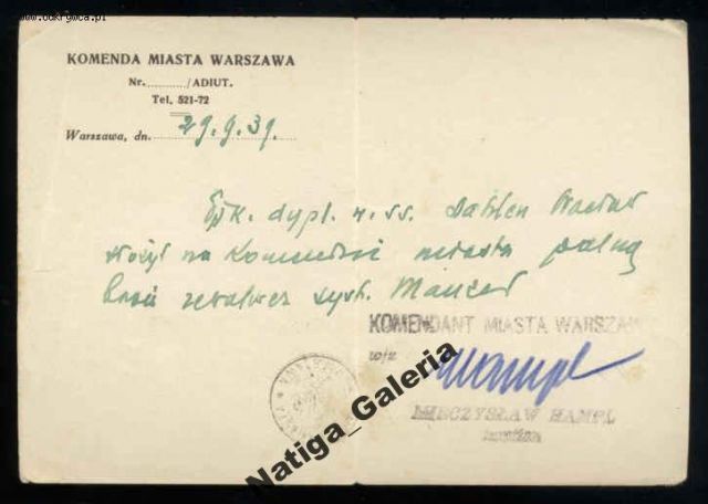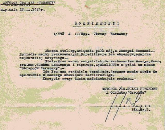 zbyszek_33 Napisano 25 Czerwiec 2010 Autor Napisano 25 Czerwiec 2010 Ostatni rozkaz płk dypl. Stanislawa Sosabowskiego dowódcy 21 pp - obrońcy pododcinka Grochów" wydany w dniu 28 września. ŻoŁnierze tej formacji tj. 21 pp i I batalionu 336 pp składali broń w Porcie Praskim, a nastepnie w dniu 29 września o godz 24.oo zgromadzili się przy wieżycach mostu Poniatowskiego (po stronie praskiej) skąd pieszo wzdłuż Alej: 3 Maja i Jerozollimskich ruszli do niewoli.