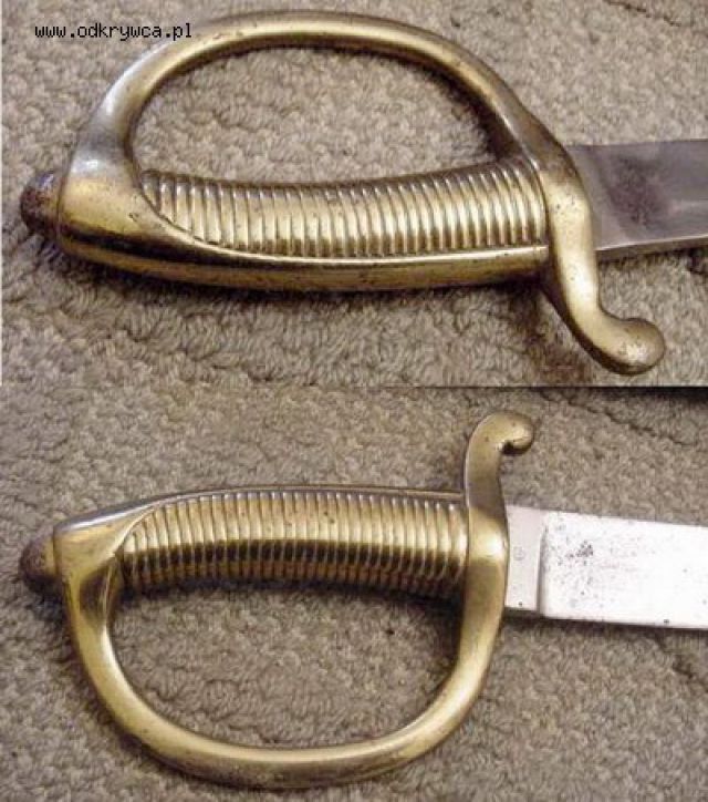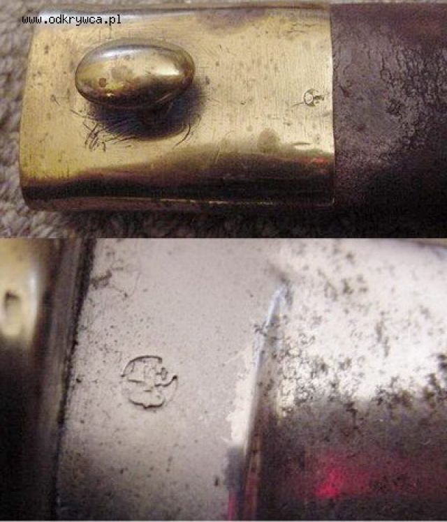 Mam pytanie kupiłem zagranicą tasak typu francuskiego jako kopię, kompletny z pochwą skórzaną. Jak go otrzymałem to wyglad jego oraz pochwy zaczął mnie zastanawiać. Pochwa wykonana z bardzo grubej skóry napewno stara, szycie przetarte w dwóch miejscach dokładnie tam gdzie powinno sie przetrzec w czasie noszenia i to długotrwałego. Na ostrzu jest punca w owalu korona a pod nia litery C T, bicia takie są również na mosiadzach pochwy i innych. Zastanowił mnie kolor mosiadzów pochwy i rekojeści. Bardzo się świeciły jak na mosiadze. Sprawdziłem je próbą jubilerską i okazało sie że wyszysko jest pokryte grubo złotem próby powyzej 2 w miejscach gdzie było uszkodzenie złota próba wykazywała mosiądz. Co to moze byc wiem ze tasaki tekie nie były złocone bo i po co? czy to cos oryginalnego ?