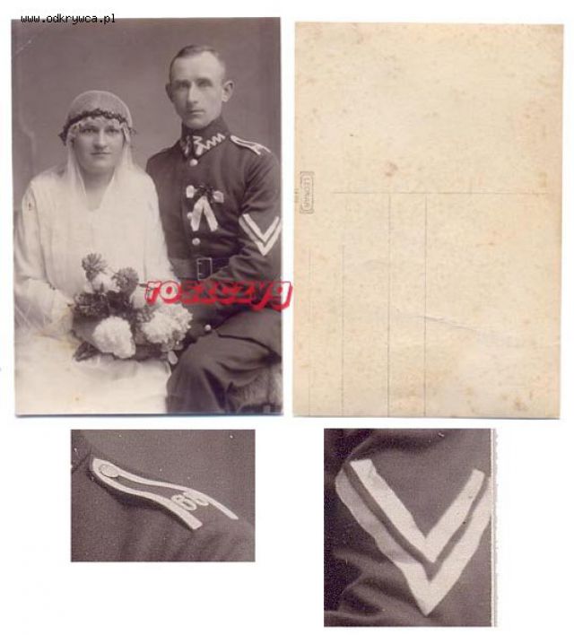lew_1988 Napisano 13 Kwiecień 2011 Autor Napisano 13 Kwiecień 2011 Ślubne zdjęcie podoficera zawodowego z 68 pułku piechoty. Na rękawie widoczne kąty" za lata wysługi, na pagonie numer 68. Wymiary zdjęcia 12 x 8 cm -z allegro
