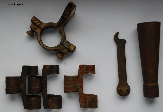 Witam serdecznie. Proszę o ID tych złomowych znajdek. Wstępnie z tego co się orientuję to mamy tu: 1. Gwizdek DP 28 ? 2. Kluczyk do zapalników - z jednej strony gałki" pionowe, z drugiej poziome, po drugiej stronie niestety ułamany klucz o w rozmiarze 11 (bicie 11") 3. Ogniwka taśmy - rosyjska? Jakiś SzWaK? 4. Obejma najprawdopodobniej od lampy - w kolorze piaskowym z numerem seryjnym i biciem k 8 T". Pisze najprawdopodobniej, bo kolega w tej samej kupce" znalazł Lampę od pojazdu w piaskowej farbie